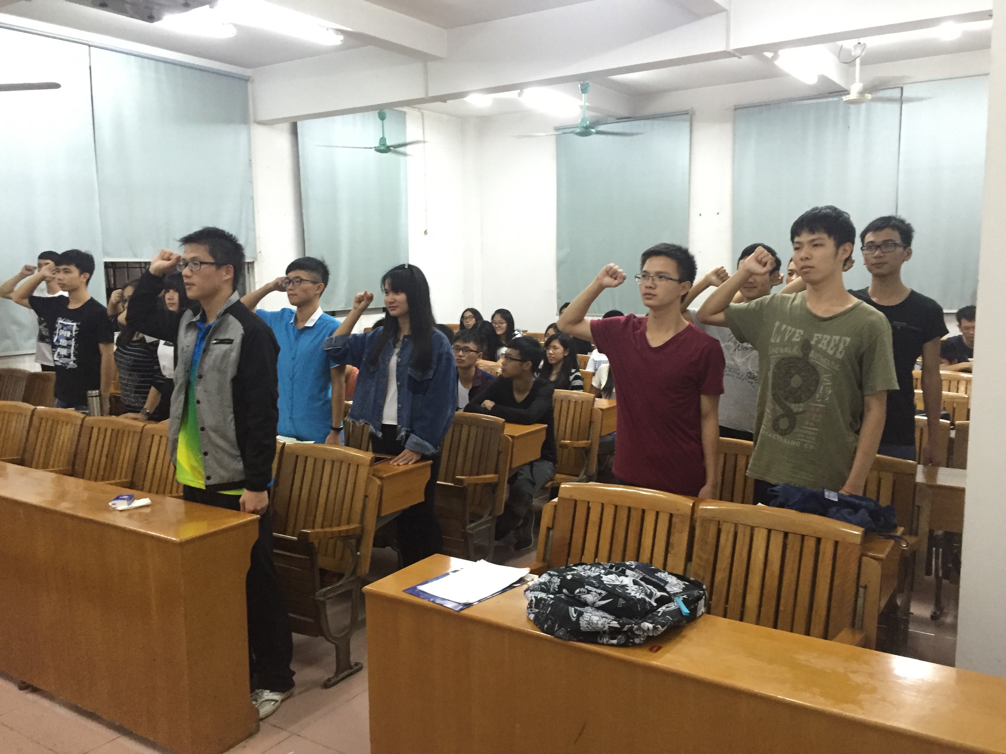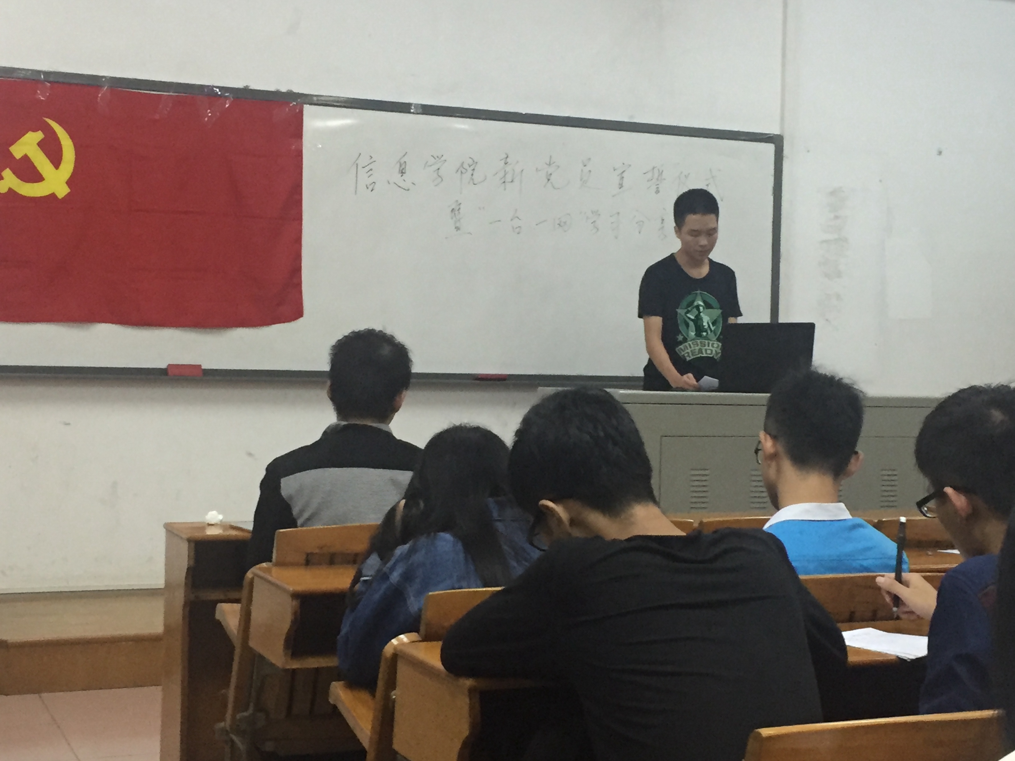 为落实“两学一做”学习教育,响应“一台一网”教育活动号召,深化学习党章精神,宣传党章知识,2016年11月21日19时,信息学院党支部及党章社全体成员在拓新楼105开展了三水校区信息学院学生党支部新党员入党宣誓仪式暨“一台一网”学习分享会活动,会议由信息学院党支部组织委员黄少俊主持。