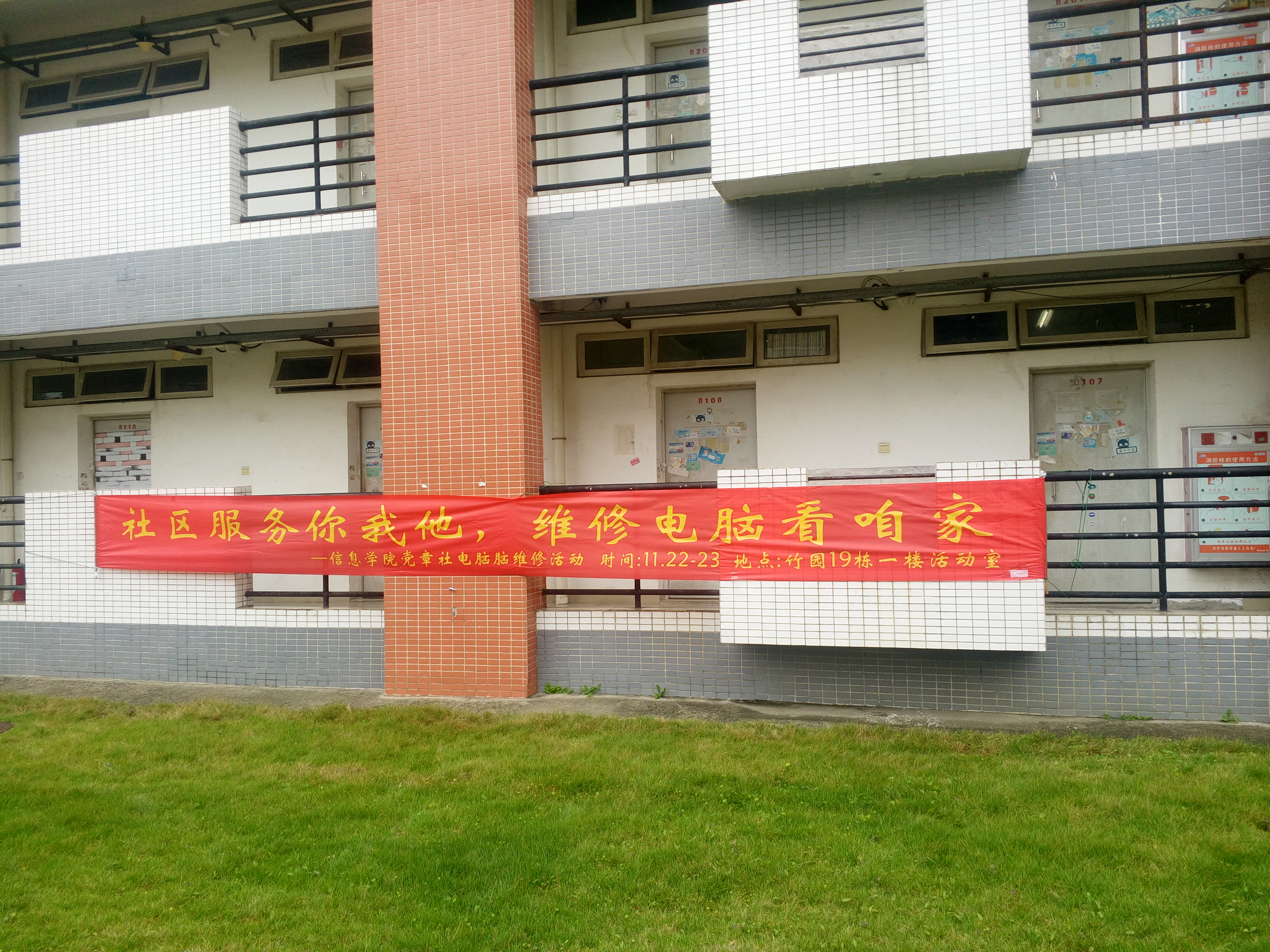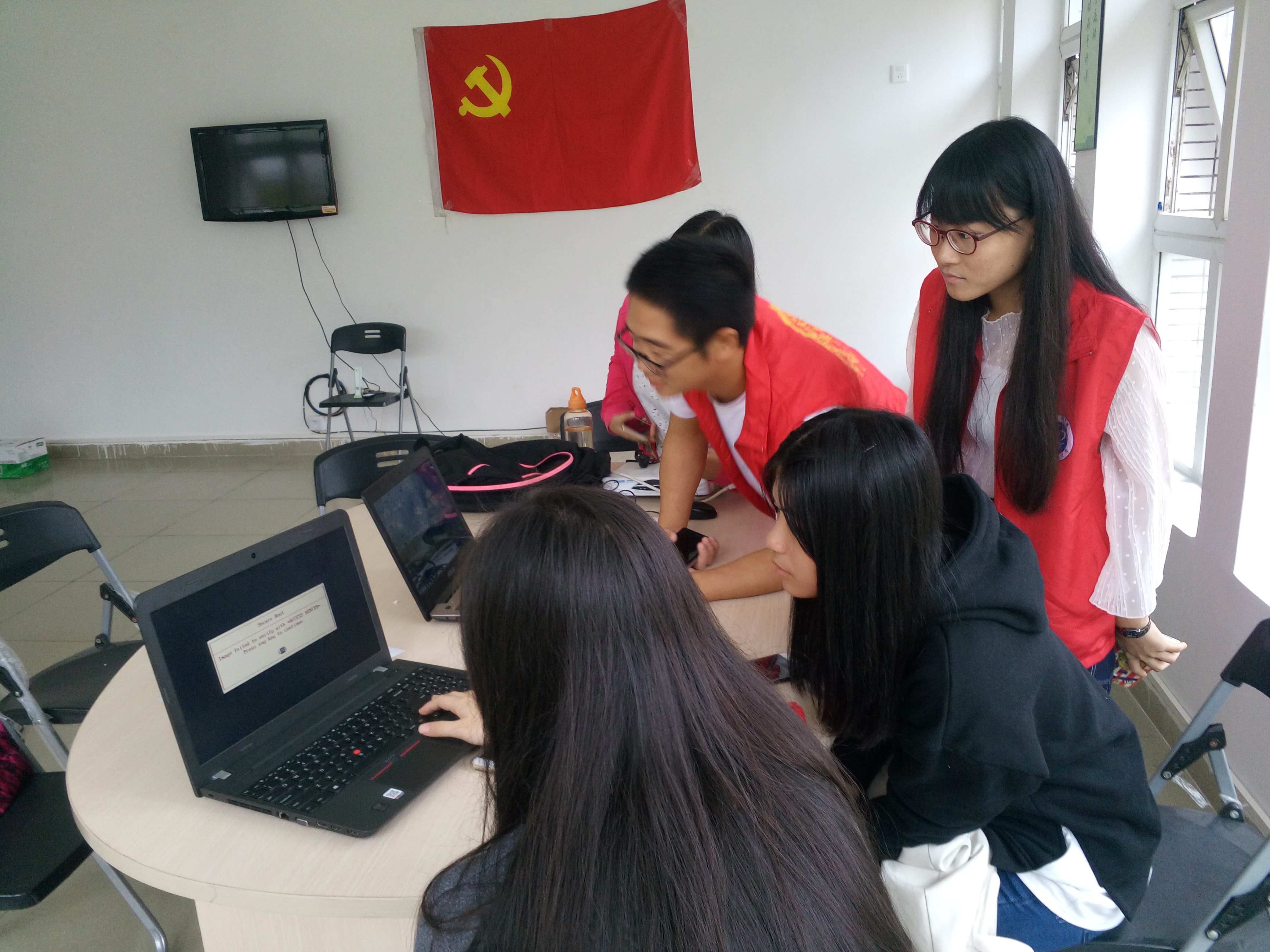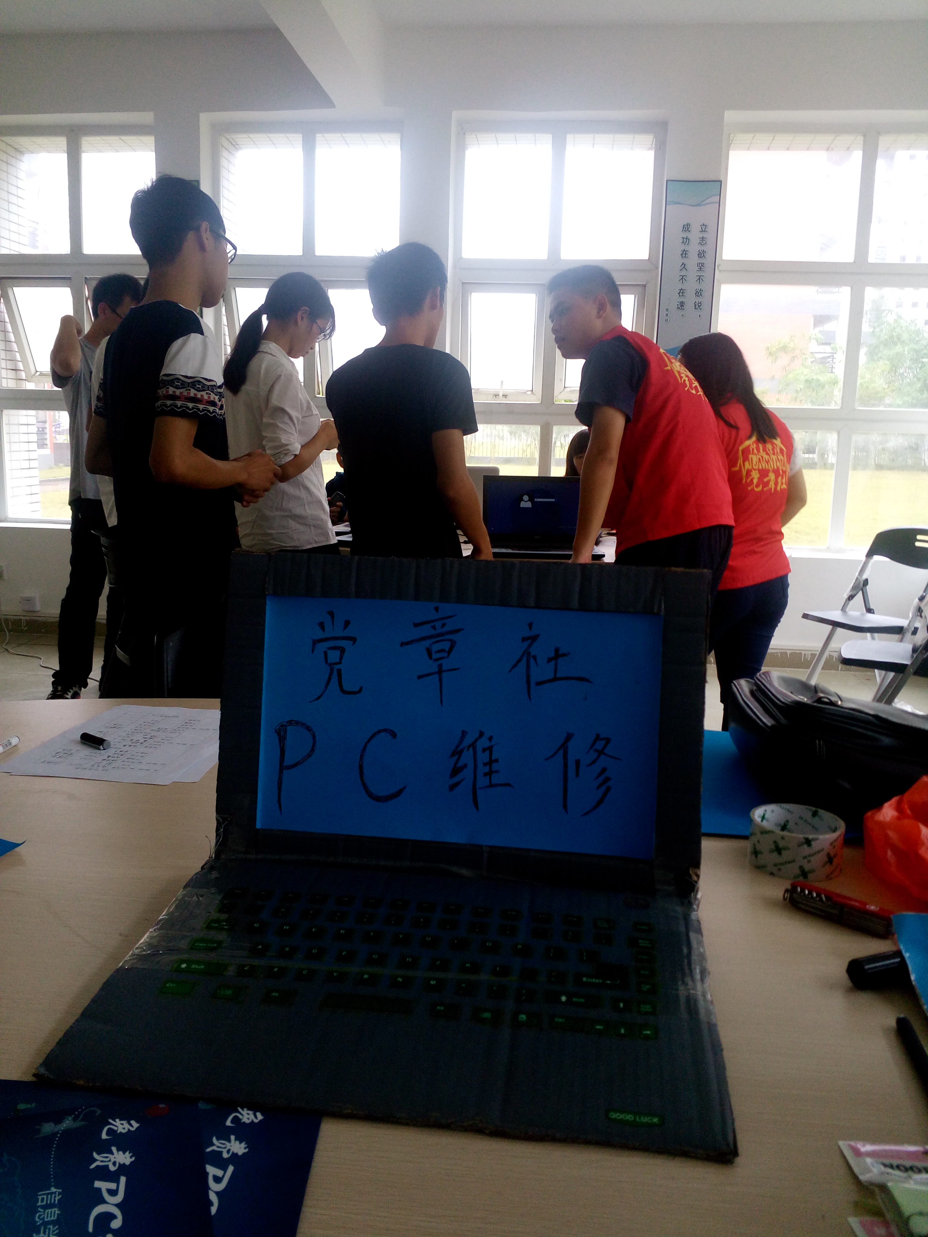 2016年11月22日至23日,为更好践行“两学一做”学习教育,发扬为“为人民服务”的宗旨,信息学院党章社在学生竹园社区19栋多功能活动室开展了“学生社区免费pc维修”活动,为校区的师生免费提供电脑维修服务。