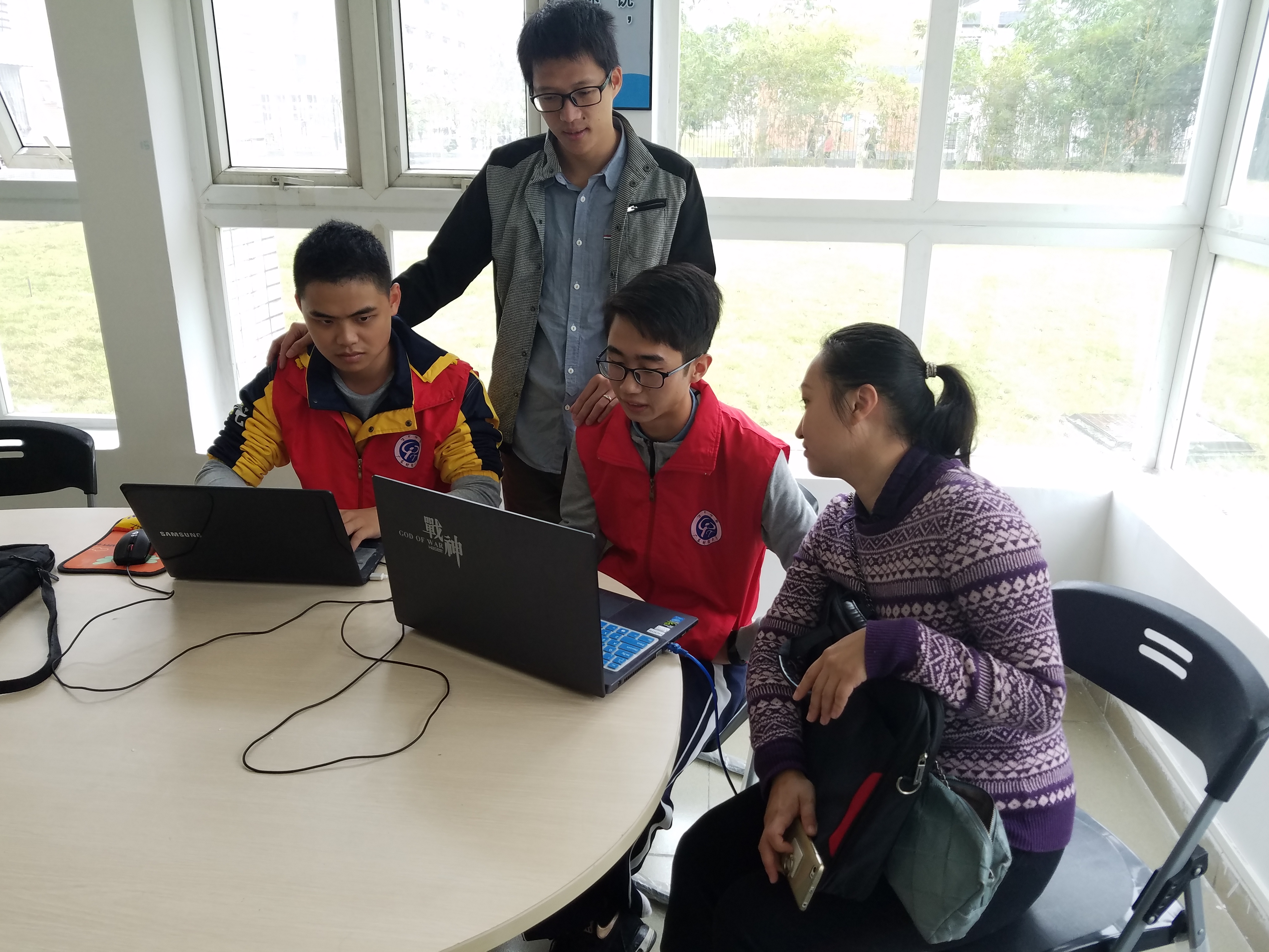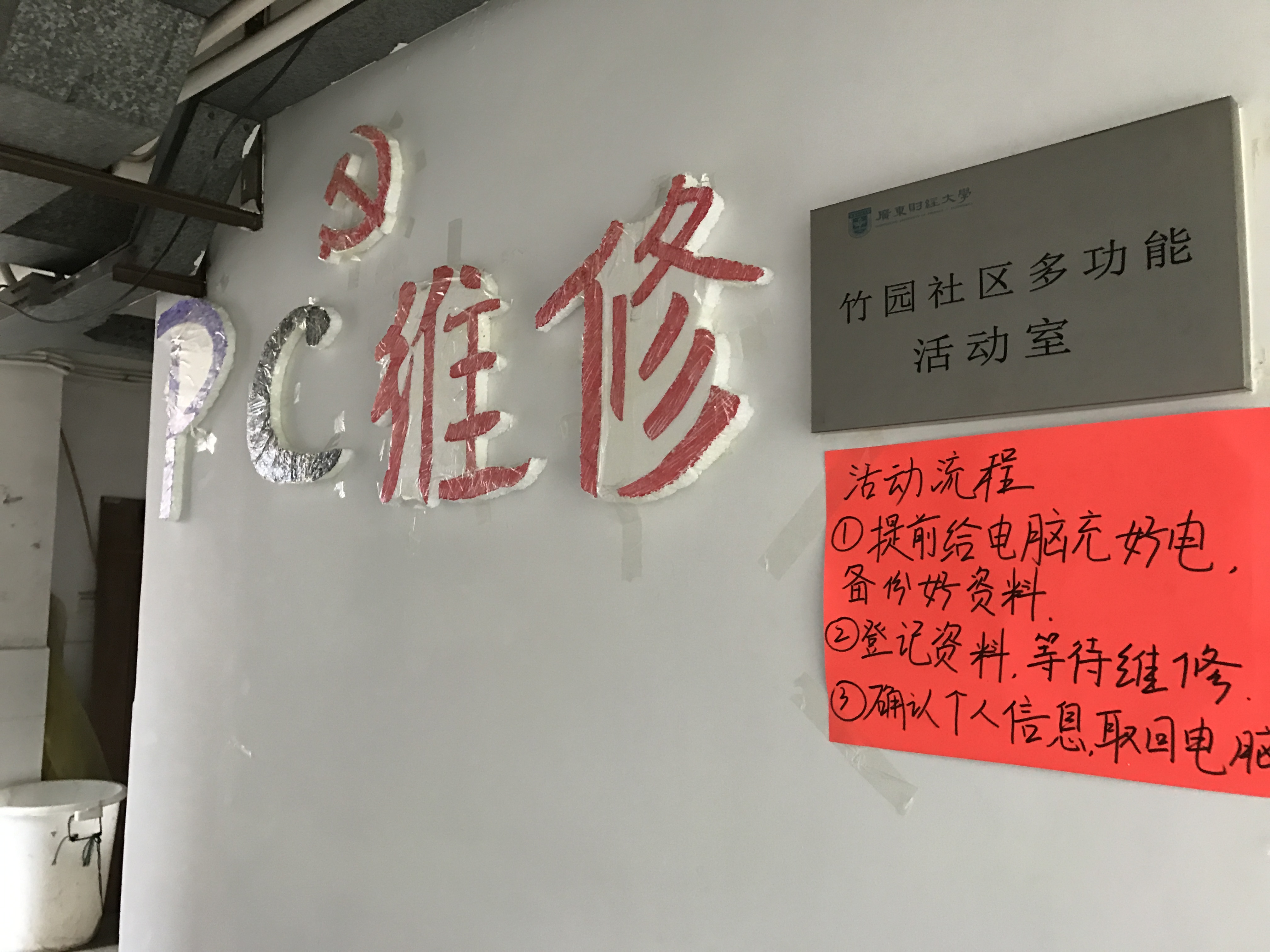 活动第一天,天气不是很好,下着大雨,但第一班的社员还是早早来到竹园,布置活动场地,做好为同学们服务的准备。 随后,各个学院同学们陆陆续续地前来维修电脑。党章社秘书部、实践部和党支部的成员们帮助同学登记信息,询问他们需要什么服务,争取为同学们提供满意的服务。然后网络部的维修人员开始为同学们提供建议、排除疑难杂症,帮助同学们重装系统,安装一些比较常用的软件。