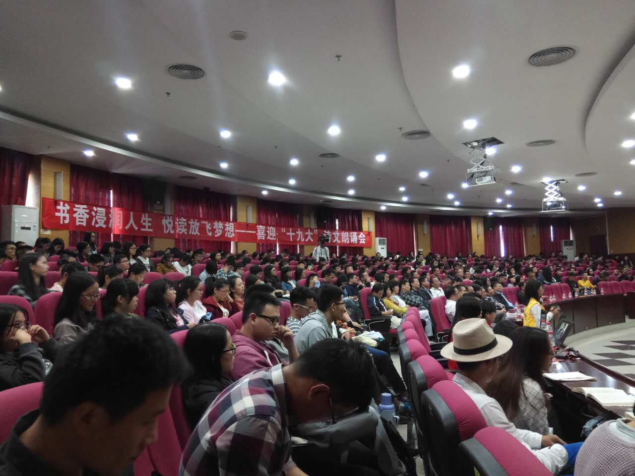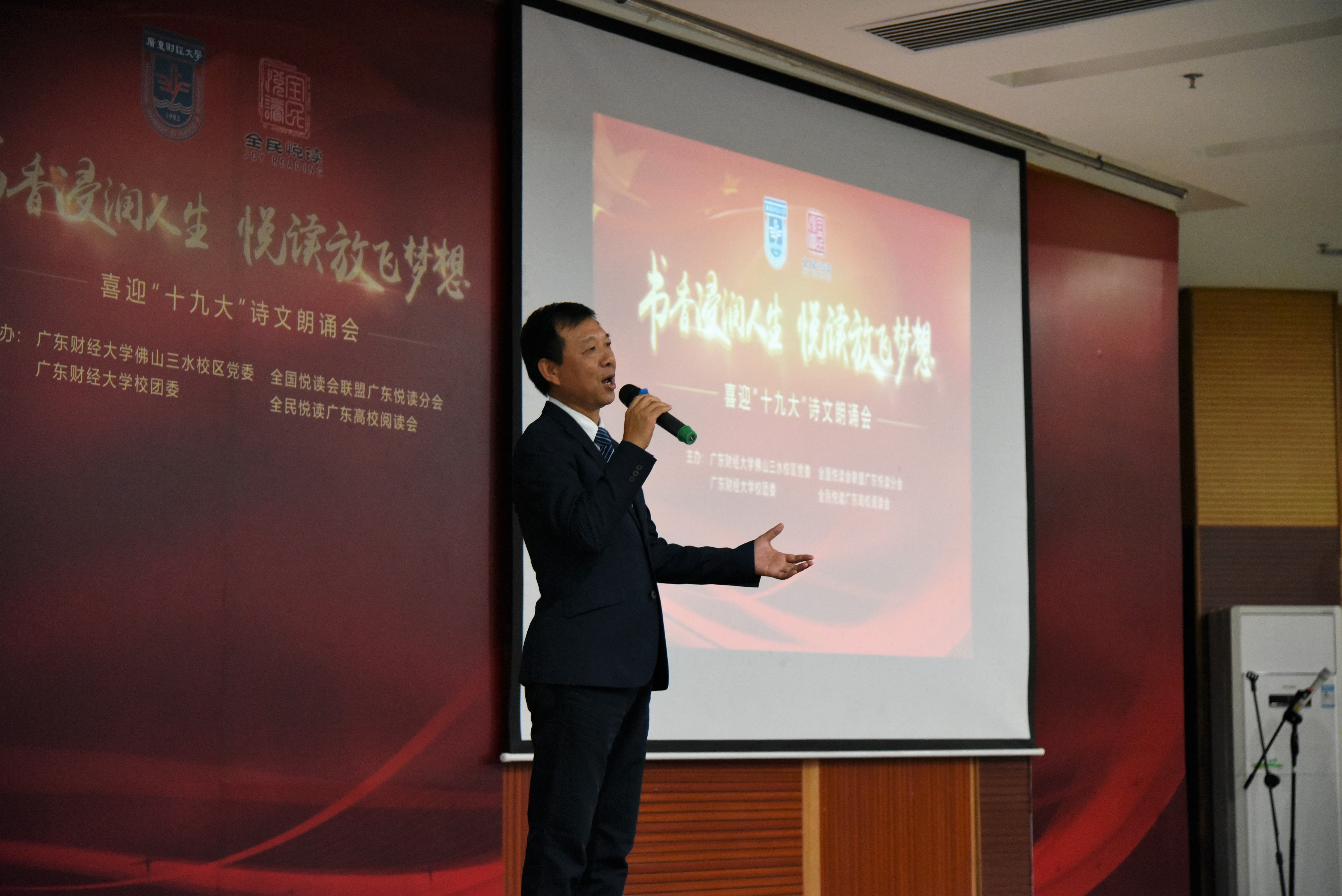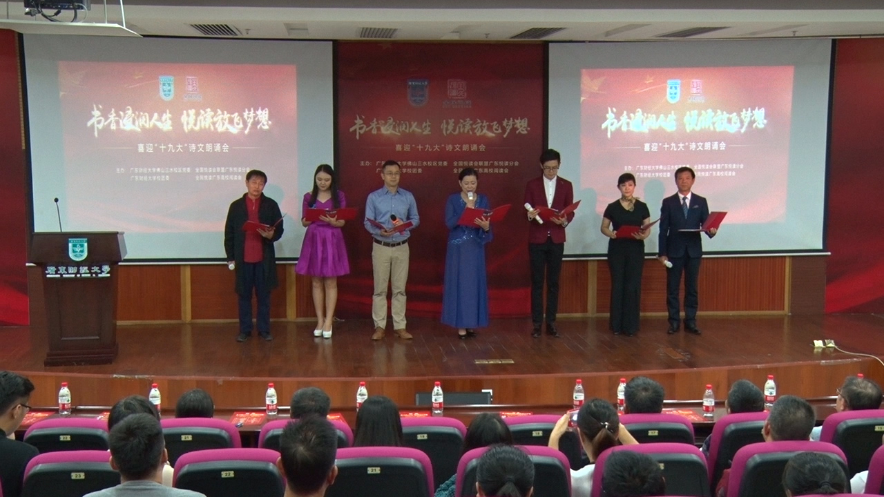 10月17日下午,以“书香浸润人生,悦读放飞梦想”为主题的喜迎十九大诗文朗诵会在佛山三水校区图书馆学术报告厅举行。活动由佛山三水校区党委、校团委、全民悦读全国阅读会联盟广东阅读分会、全民悦读广东高校阅读会联合举办,邀请了朗诵艺术家与我校师生一同用诵读诗文经典的形式感受“悦读”的快乐,喜迎党的十九大的到来。