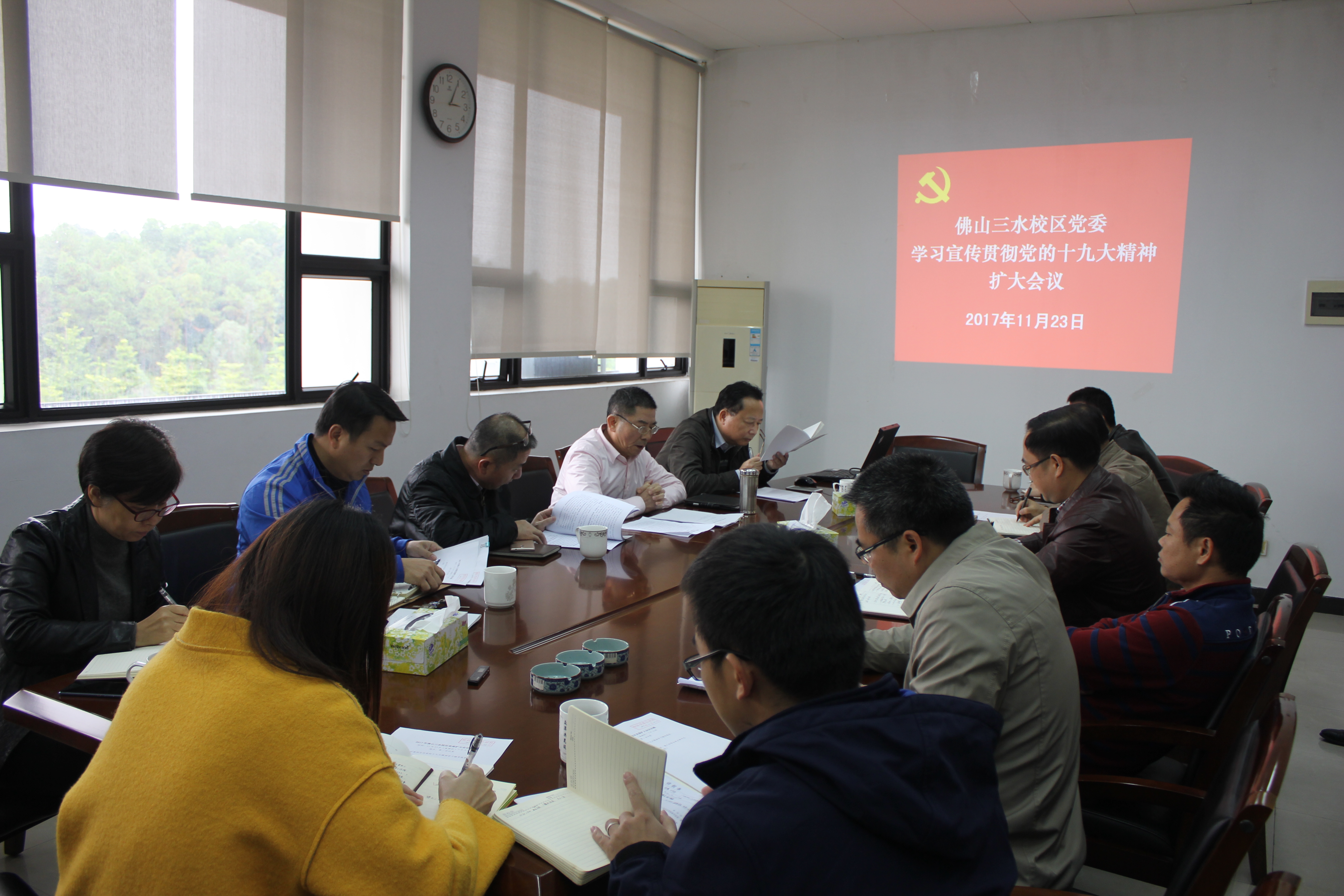 “不忘初心、牢记使命”“为决胜全面建成小康社会、夺取新时代中国特色社会主义伟大胜利、实现中华民族伟大复兴的中国梦、实现人民对美好生活的向往继续奋斗!”十九大所发出的伟大号召振奋人心,为使校区党员更好地学习宣传贯彻党的十九大精神,佛山三水校区党委于11月23日下午在厚德楼第二会议室召开了党委扩大会议,校区党委书记谢访春作了专题辅导报告。校区党委委员、教工和学生党支部书记参加了会议。