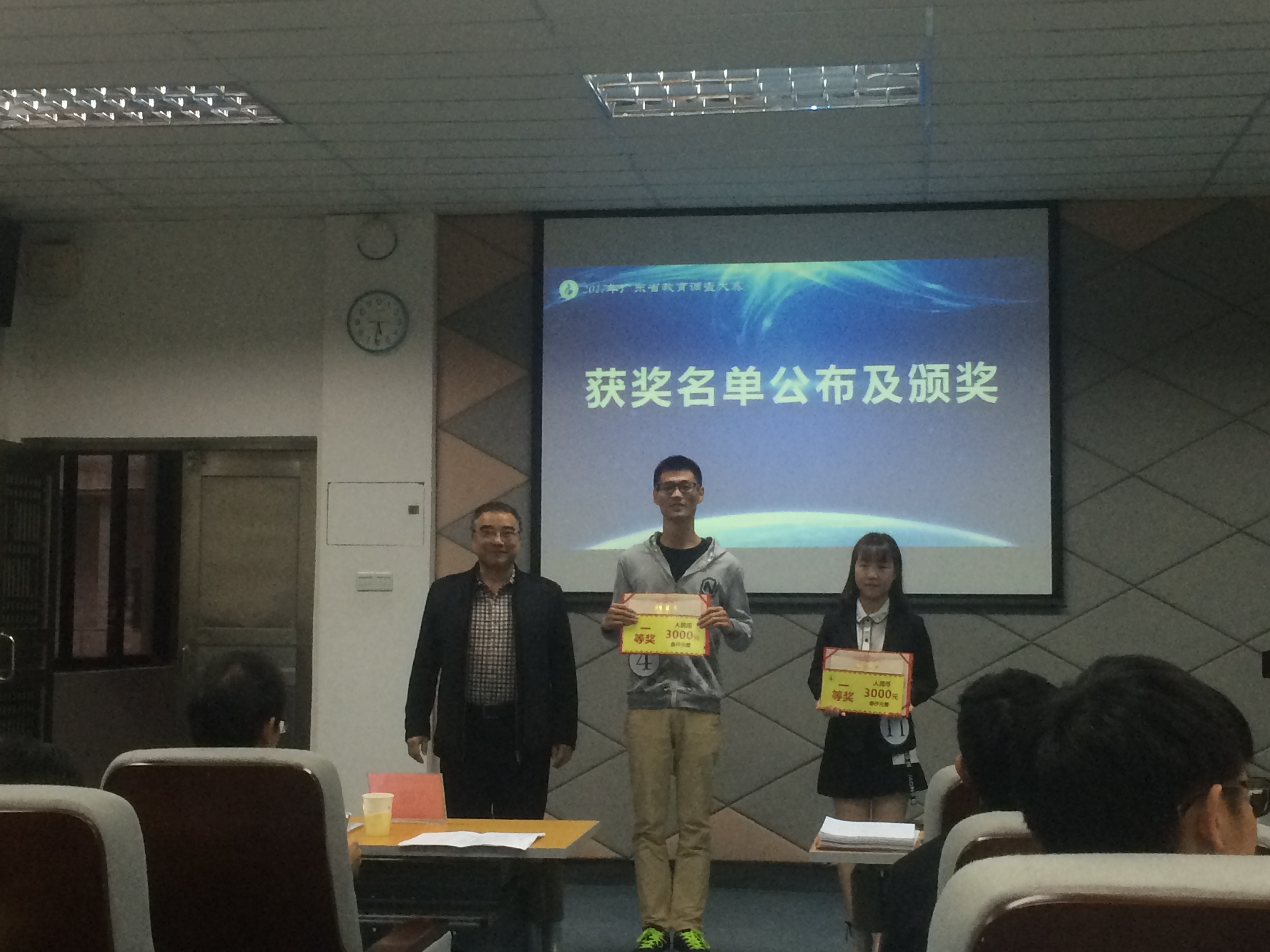 近日,2017年广东省教育调查大赛答辩决赛在华南师范大学举行。由统计与数学学院学生郑健松、周修杰、张莹组成的我校代表队在答辩中以从容自信的仪态、流畅的应答和精美的PPT展示脱颖而出,夺得一等奖。