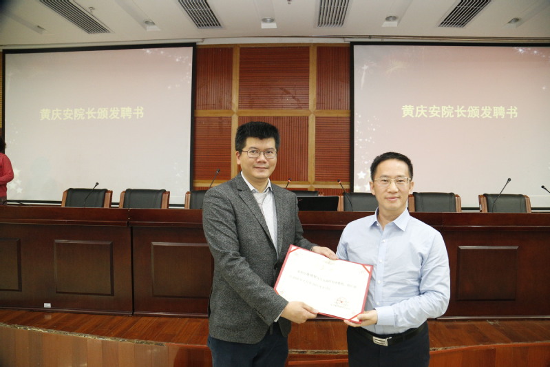 会上,唐倚智被聘任为我校客座教授,黄庆安向其颁发聘书。
