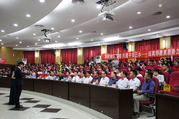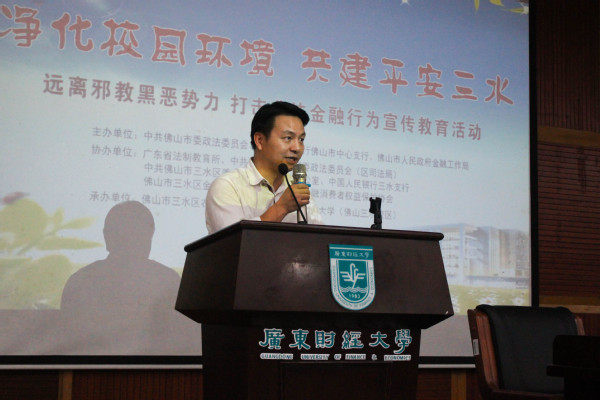 4月24日下午,“净化校园环境 共建平安三水——远离邪教黑恶势力 打击非法金融行为”宣传教育活动在我校佛山三水校区学术报告厅举行。