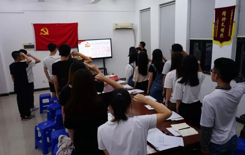 2018年5月3日晚,佛山三水校区公共管理学院学生党支部在行政楼410召开党员大会,顺利接收梁吴忠等10名发展对象为中共预备党员。通表大会后,党支部举行新党员入党宣誓活动。党支部书记李颂同志领誓,10名新党员在鲜红的党旗前举起右拳,庄严宣誓,支部其他党员也跟着重温入党誓词。