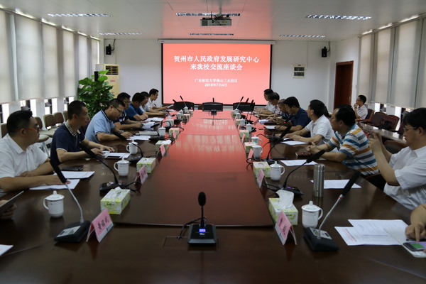 7月4日,贺州市人民政府发展研究中心主任周洪波,副主任杨超武,富川瑶族自治县人民政府副县长曾志辉及贺州市相关行业、企业代表一行来到我校佛山三水校区座谈交流。我校佛山三水校区党委书记、管委会常务副主任谢访春,党委副书记钟智,管委会副主任傅道忠、柳国斌,佛山现代服务业研究院院长林仲豪,商贸流通研究院院长王先庆,文化创意与旅游学院院长贾毅等相关部门负责人出席座谈会。