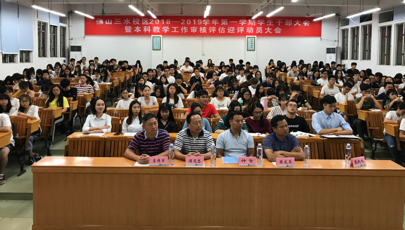 9月28日晚,佛山三水校区2018-2019学年第一学期学生干部大会暨本科教学工作审核评估学生干部动员大会于校区第一教学楼307教室举行。校区管委会党委副书记钟智、校区管委会副主任傅道忠、学工部副部长兼校区学工办主任陈发荣、教务处副处长兼校区教务办主任李伟军、校团委副书记兼校区团工委书记张鹏程、校区各校级学生组织指导老师、校院两级团学组织主要学生干部及各学生社团负责人参加会议。会议由张鹏程主持。