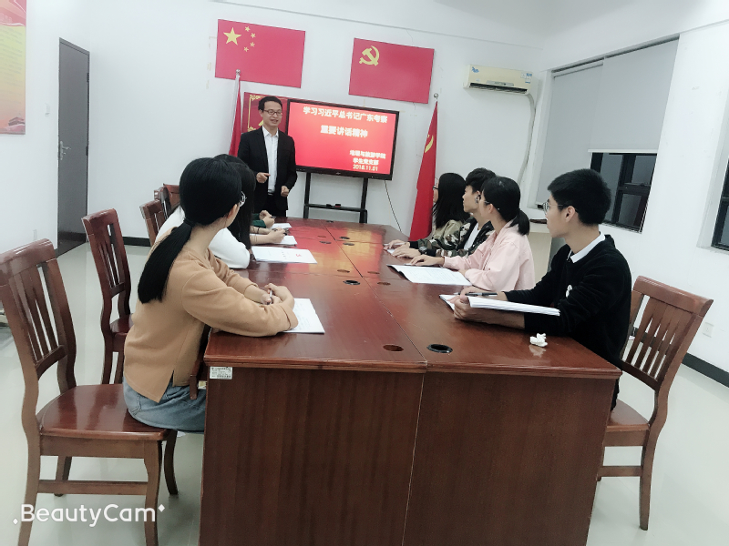 2018年11月1号晚上,佛山三水校区党委地理与旅游学院学生党支部在厚德楼418召开学习贯彻习近平总书记广东考察重要讲话精神会议。参加会议的有3名正式党员以及7名发展对象。