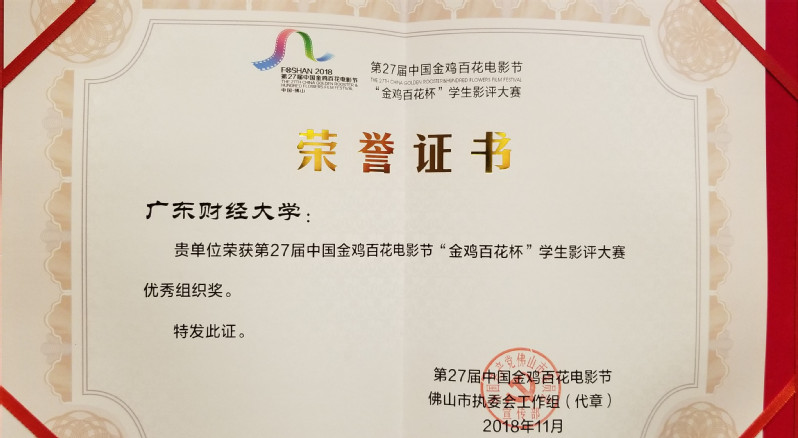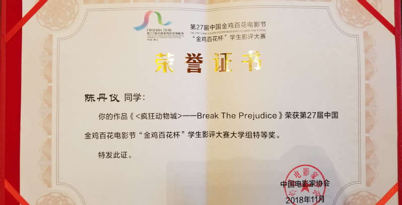 11月10日下午,中国电影高峰论坛优秀学术论文暨“金鸡百花杯”学生影评大赛颁奖仪式在佛山举行。我校法学院2017级陈丹仪同学的影评作品《“疯狂动物城”——Break The Prejudice》荣获大学组特等奖。此外校区学生另有1件作品荣获大学组一等奖、4件作品荣获大学组二等奖,2件作品荣获大学组三等奖,学校获评此次影评大赛“优秀组织奖”。