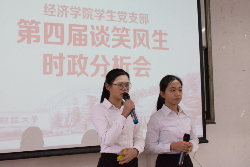 2018年12月11日下午,校区经济学院学生党支部于励学楼206开展第四届谈笑风生时政分析会。本次会议邀请到的嘉宾评委有:学工办老师陆奕焕,经济学院学生党支部书记符可,辅导员张李敏、李史干。