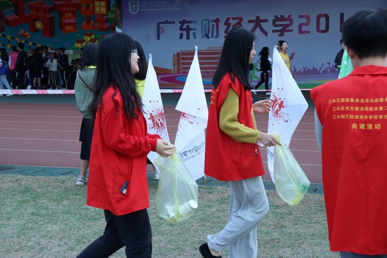 在运动员挥洒汗水,工作人员尽职尽责的背后,身穿红色党服的志愿者们也是财税学子在校运会上一道亮丽的风景线。本着“全心全意为人民服务”的宗旨,校区财税学院学生党支部开展校运会志愿者活动,服务财税学子,助力校运会。