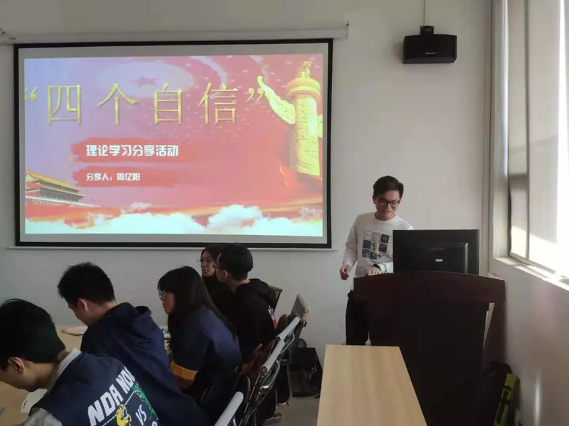 周亿阳同志则为在座的与会成员讲解四个自信。“四个自信”是习近平总书记在中国共产党95周年成立大会上提出的中国特色社会主义道路自信,理论自信,制度自信,文化自信。周亿阳同志的发言让各位更加深入理解和感悟四个自信对中华民族走向复兴的主要意义。