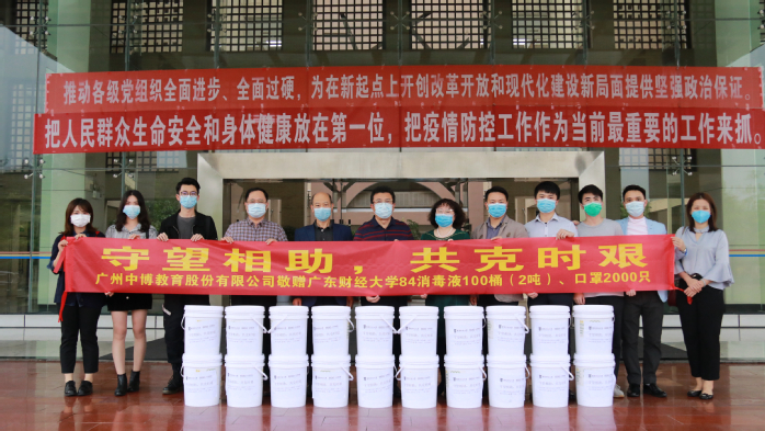 当日上午,广州中博教育股份有限公司广州分公司总经理原雯婷一行向我校捐赠疫情防控必备物资,包括一次性医用口罩2000个、84消毒水100桶(2吨)。
