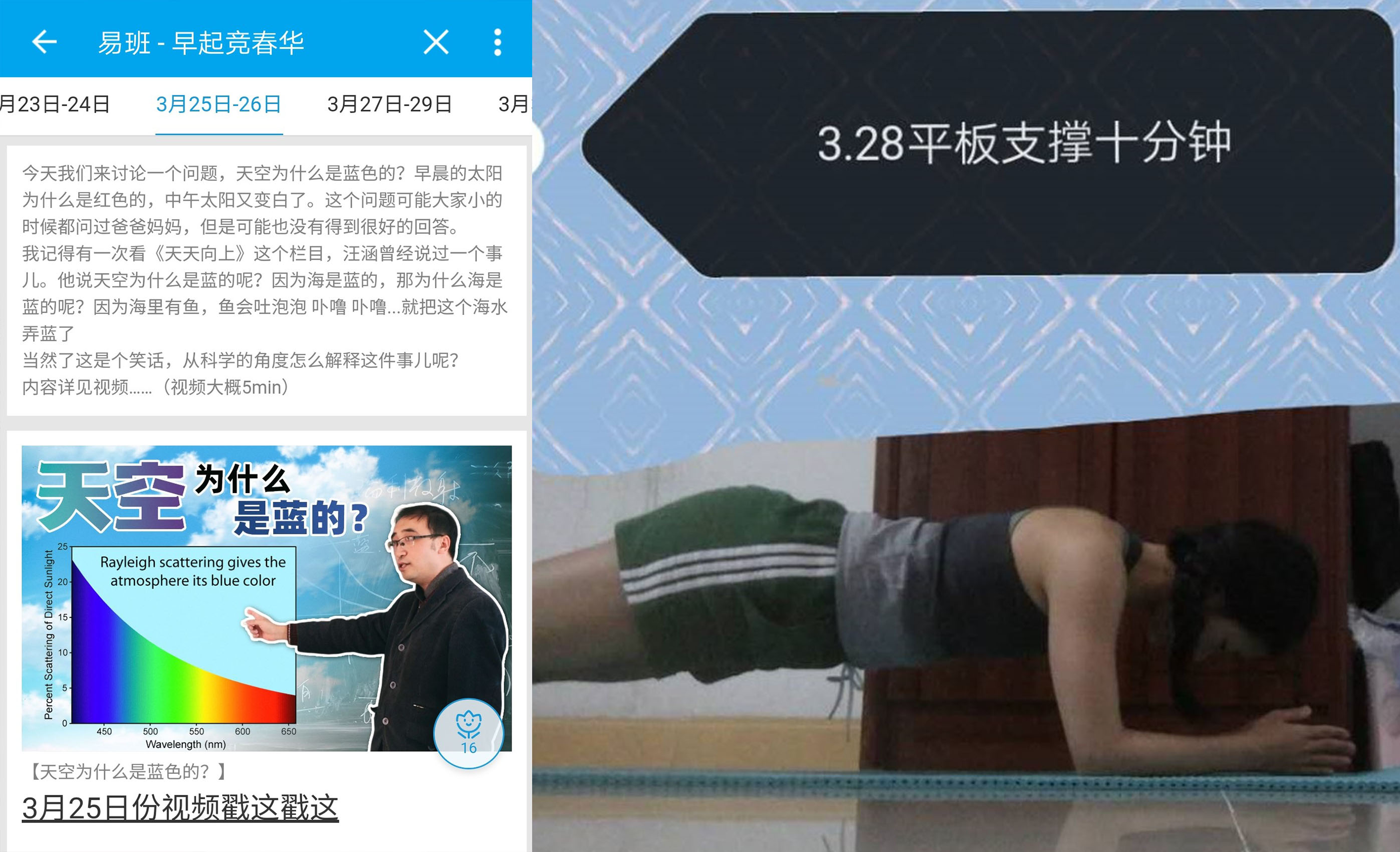 自网络教学模式启动以来,校区利用易班学生工作站开展多种督促学习的活动,极大调动了学生居家学习的积极性。校易班学生工作站率先开启第十季21天习惯养成活动,同时,该活动还设置了早起登录易班打卡并答题环节,题目涉及天文、地理等诸多方面,活动共吸引超过1000人参与,浏览互动次数超过2万次。各学院易班工作站也陆续开展相关活动,如统计与数学学院易班工作站每天上午7:00-8:30展示所收集的有趣视频,并设置打卡,共有超过300人参与。人文与传播学院易班工作站面向所有学生开展“易”起运动打卡活动,参与者将在家运动照片发布到易班app进行打卡,活动吸引多个学院300多名学生参加。