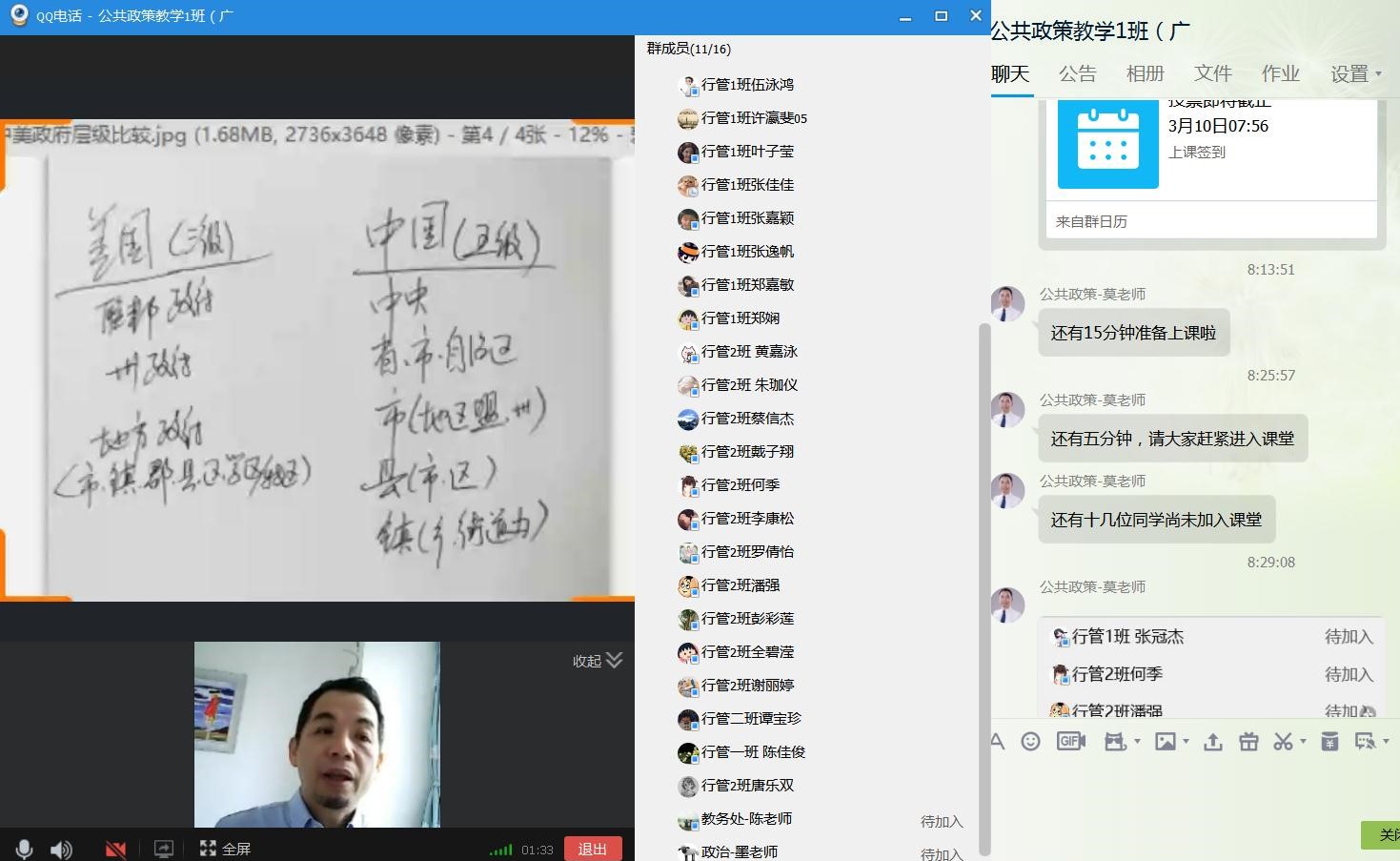自3月9日至今,通过优化教学平台,提升网络承载力,校区将教务基础数据与平台对接,编制网络教学技术指引手册,组织教师培训,及成立技术咨询组为师生开展网络教学等措施,保障网络教学顺利开展。佛山三水校区本学期开设课程423门,任课教师共有648位,选课学生共有11240名,每天进行网络授课的教学班约520个,网络教学参与率达到98%以上。3月11日上午,副校长陈国栋就网络教学开展情况来校区视察,要求校区各部门全力配合做好教学及相关保障工作。