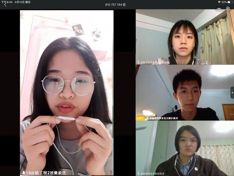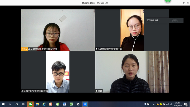 2020年4月11、12日晚,金融学院学生党支部成员采用线上会议的方式,对第66期申请入党的73名成员逐一进行线上面谈。支部成员就入党动机、对中国共产党的认识、服务群众经历和疫情防控期间重要表现等多个方面了解申请人员的思想状况和实践经历并做好评分与记录,以认真严谨的态度为组织遴选出合格的新生力量。