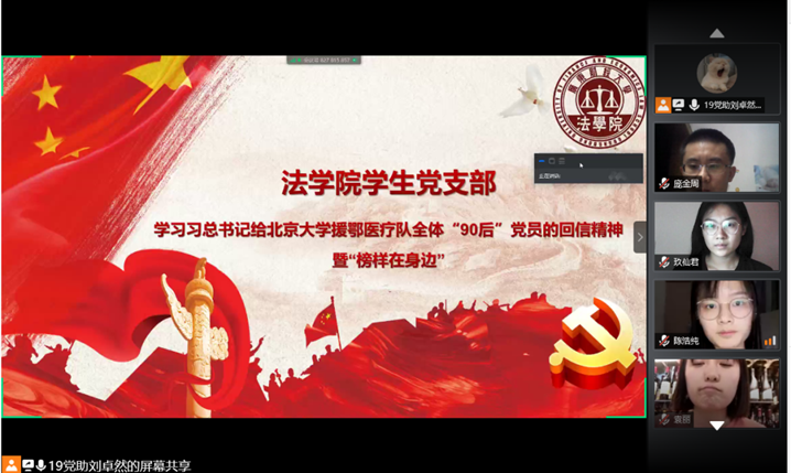 5月8日晚,支部在线上顺利举行“学习习近平总书记回信精神暨榜样在身边”分享会,来自18级法硕班的袁丽、19级法学二班黄丽仰、18级法学七班陈浩纯、18级法学一班张僖樱、19级法学四班黄丹琦等五位同学分别讲述了自己在这场抗疫斗争中从事志愿服务的经历。