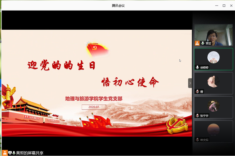 根据学校《关于开展基层党组织常态化疫情防控“四个一”活动的通知》精神要求,地理与旅游学院学生党支部于2020年7月13日,开展了“迎党的生日、讲战役故事、悟初心使命”为主题的组织生活会。会议由党支部书记黄哲主持。