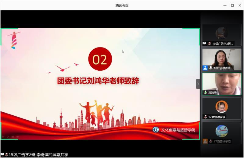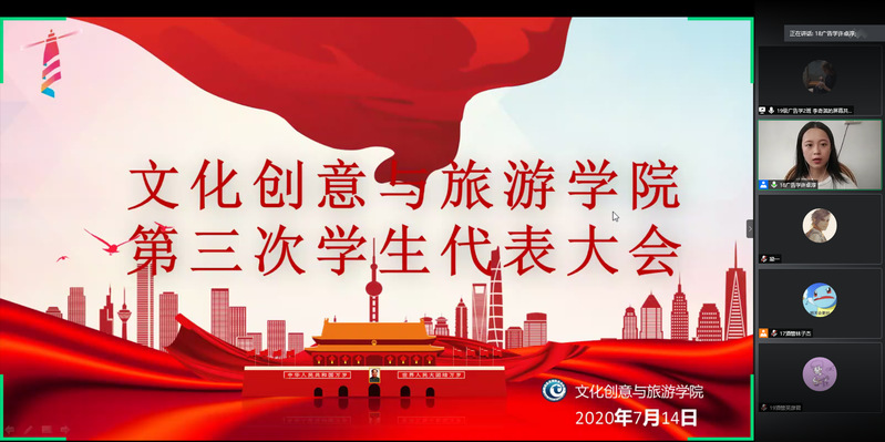 2020年7月14日下午15:50,文化创意与旅游学院第三次学生代表大会于腾讯会议顺利召开。学院党总支书记柳国斌、团委书记刘鸿华、辅导员刘凤娇及学院111名学生代表参加了本次会议。