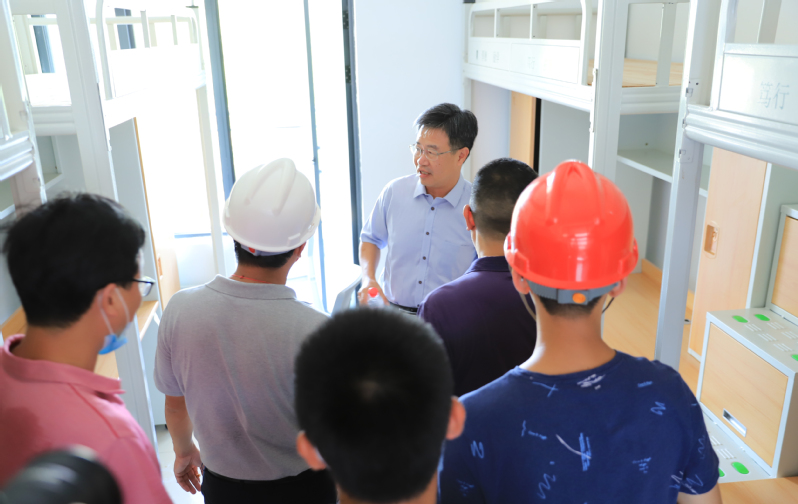 陈国栋深入学生宿舍,仔细查看桌椅床铺、水电卫浴安装质量等情况;到小区周边查看道路硬化、环境美化绿化等情况,检查结束后,再次就消防安全、公寓管理、疫情防控、学生安全等问题与陪同人员进行深入交流,并提出相关工作要求。
