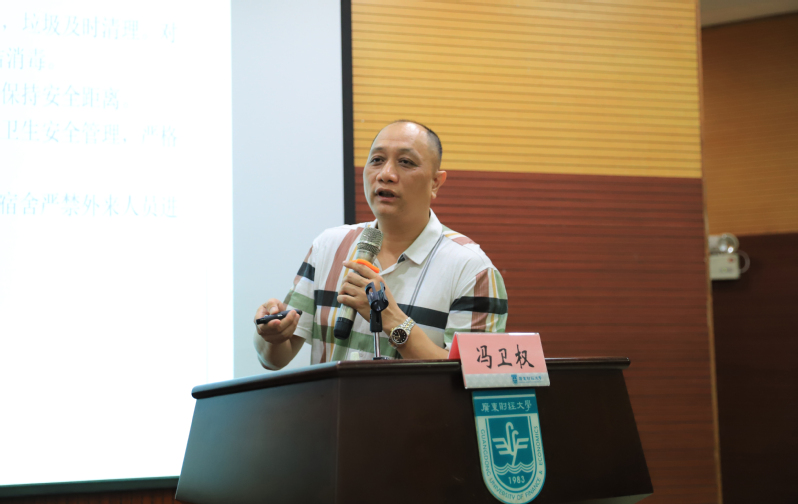 冯卫权分享了获得“共和国勋章”的钟南山院士及其他“人民英雄”为国抗疫的感人事迹,详细讲解了新冠肺炎及疫苗基础知识。他介绍了新冠肺炎的判断标准、临床表现、传播途径、有无症状感染者等分型标准;他重点详细讲解了新冠肺炎疫情防控策略,重点介绍了个人居家及公共场所防控手段。他强调,预防要从严格佩戴口罩、勤洗手做起,校区要做好教室等公共场所通风、学生错峰就餐、严格食品卫生检查、做好其他传染病预防等防控工作,加强学生监管、做好防控应急预案,进一步完善校区师生员工分级别、分类型、整体协同的防控网络。冯卫权还分享了其他学校的疫情防控经验。