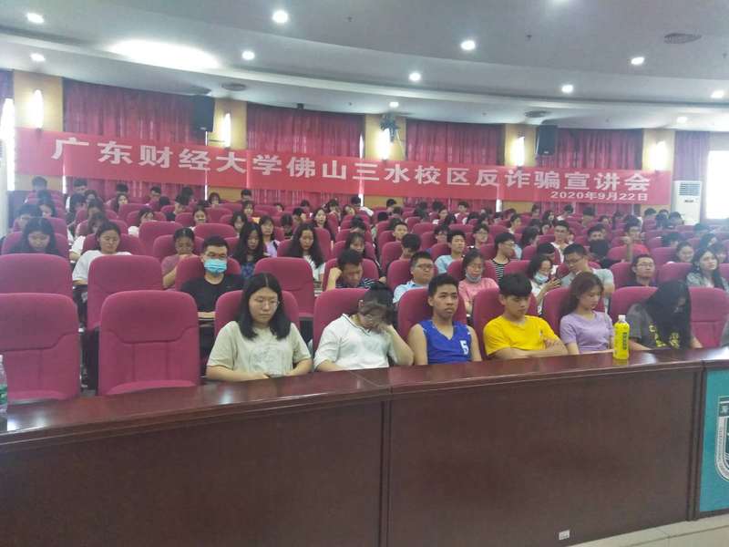 2020年9月22日下午由学工办、保卫办和三水反诈骗中心联合举办了的反诈骗宣讲会在校区图书馆报告厅举行,主讲人星警官,陈发荣主任和新生辅导员、班主任助理共计200余人聆听了宣讲会。