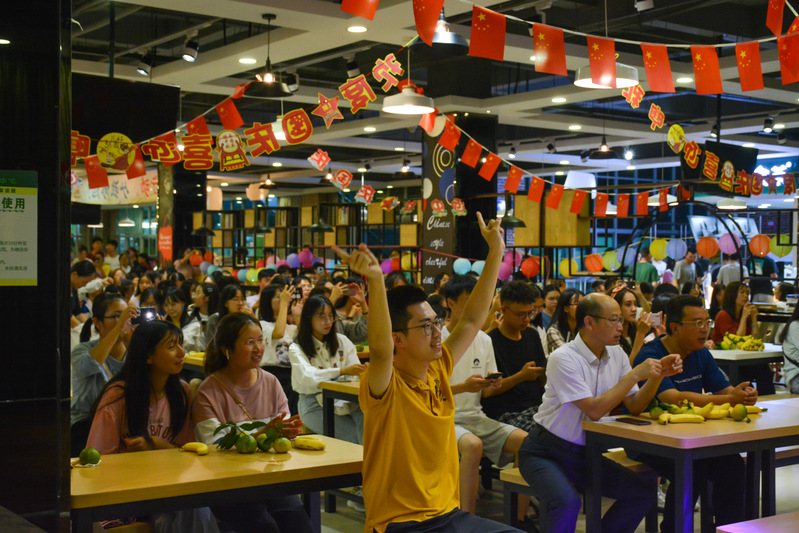 10月1日晚上,校区学工办、团工委、饮食服务中心共同承办了“迎中秋联欢活动”,管委会校领导与留校学生齐聚一堂,共同参与了活动。猜灯谜、音乐表演、观看央视中秋晚会构成了这次活动的主体内容。校区信息学院蔡键青老师带来的歌曲赢得了在场师生们的阵阵掌声,街舞串烧等表演使得现场气氛火热。活动最后,全体人员一起合唱《我和我的祖国》,合唱声起,国旗飘扬,自豪之情在心间流淌。