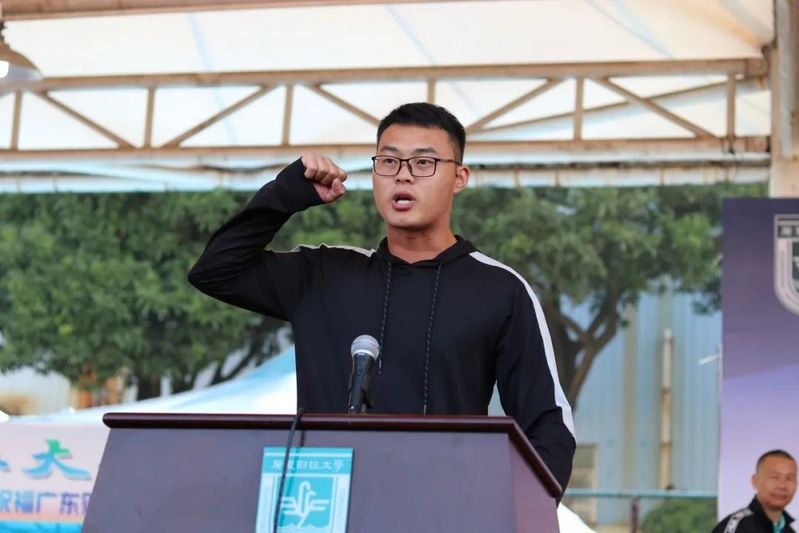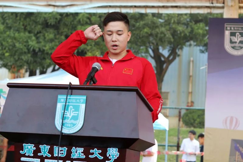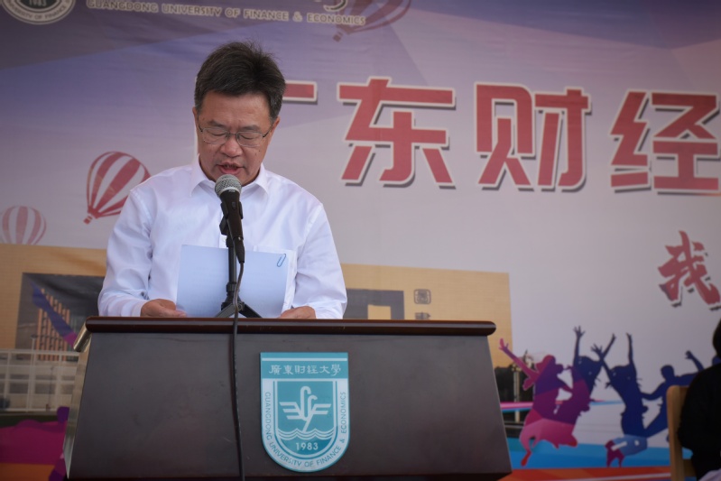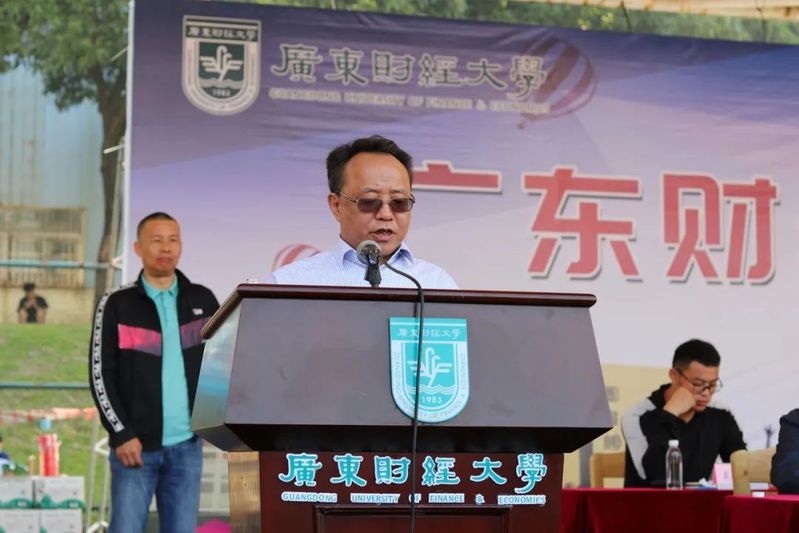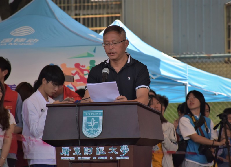 于海峰校长致开幕词。他从党的远景、目标出发,引用习近平总书记体育强国理念的相关讲话,强调了参加体育运动的重要性。他对在场的老师与同学们阐述校运会所代表的体育精神,并倡导将此体育精神融贯于日常生活中,使同学们实现德智体美劳的全面发展,在提升自身身体素质与健康水平的同时,为建设粤港澳大湾区一流财经大学作出自己的贡献。