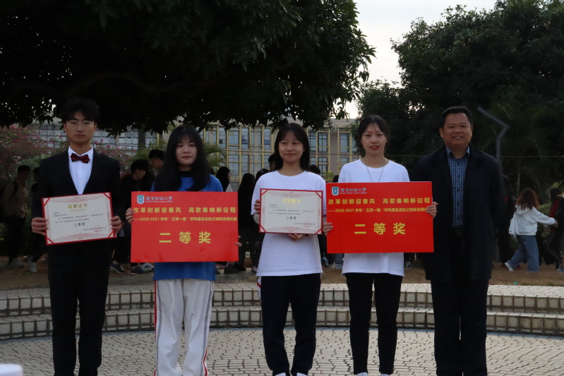 经济学院20级国际经济与贸易3班热情饱满,阳光四射,在冬日的朝霞下为我们献上一曲暖人心扉的歌曲《我们都是追梦人》,以优秀的唱功和快乐的感染力获得评委的一致好评,摘得桂冠。财政税务学院20级税收学2班和信息学院20级计算机科学与技术1班分别演绎了《我爱你中国》和《我和我的祖国》,歌曲中洋溢着深切的爱国之情,歌颂伟大的祖国母亲,形式各异,势均力敌,同获二等奖。工商管理学院、公共管理学院、人文与传播学院的参赛班级表现优秀,共摘三等奖。赛后艺术学院张雪娜老师为各班合唱做精彩专业点评,表示通过此次班级合唱赛,有效凝聚班级力量,展现广财学子靓丽、奋斗、激情、只争朝夕不负韶华的青春面貌。钟智老师、陈发荣老师、张雪娜老师、张健民老师分别为一、二、三等奖和优胜获奖班级颁奖。