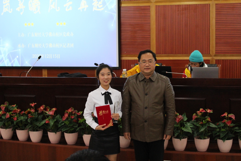 校区党委副书记钟智做总结发言,钟智对本次风云记者大赛的举办表示肯定,他指出,本次风云记者大赛环节设置恰当,现场组织井然有序,整体质量水平较高,作为记者团已经连续举办十三届的品牌活动,展示了我校第二、三课堂的显著成果,是我校素质教育改革创新的典范,本次大赛的参赛选手新闻专业技能扎实,语言表达得体,现场表现优异,综合素质较高,展现了我校大学生良好的精神面貌。钟智表示,我校第一次党代会确立了六个一流的建设目标,其中一流的人才培养体系建设离不开广大学生和教师的积极参与,学校也将进一步促进广大学生社团的提升与发展,配备专业指导教师对社团活动开展进行指导,搭建更加优质的活动中心为学生社团提供平台支持,也希望同学们能够严格要求自我,努力提升综合素质能力,不断学习,努力成才,为我校建设成为大湾区一流财经大学做贡献。