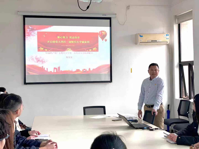 最后陈发荣着重向与会党员报告本次党代会精神:一个目标、两步走、三个坚持、四个有待、五个始终、六个一流。一个目标:建设大湾区一流财经大学。两步走:到2025年,基本建成大湾区一流财经大学;到2033年(建校50年),全面建成大湾区一流财经大学。三个“坚持”:坚持重点突破、坚持协同发展、坚持综合改革。四个“有待”:干事创业的精气神有待提振;重点领域改革发展有待破局:人才培养特色和创新有待加强;党建思政工作有待加强。五个“始终”:始终坚持党的全面领导,始终坚持服务面向,始终坚持内涵发展,始终坚持改革创新,始终坚持共建共享。六个一流是指:以一流党建统领一流人才培养体系、一流学科专业体系、一流师资队伍、一流科研和社会服务体系和一流治理体系。