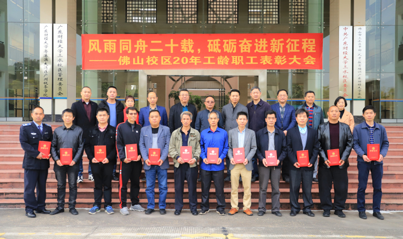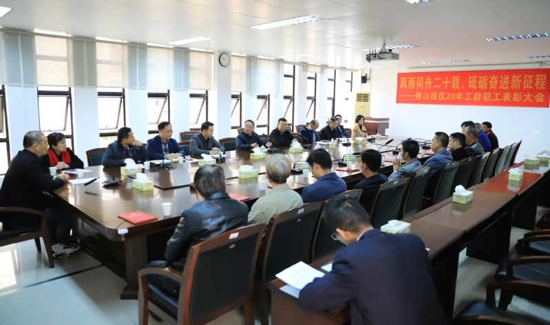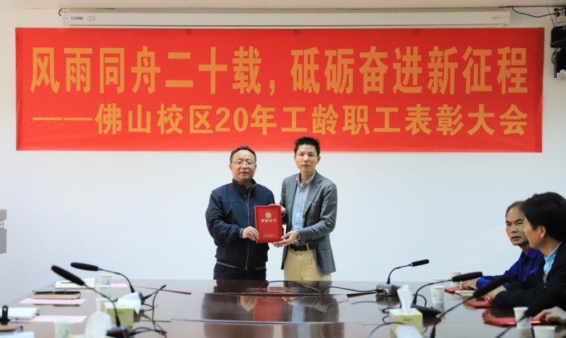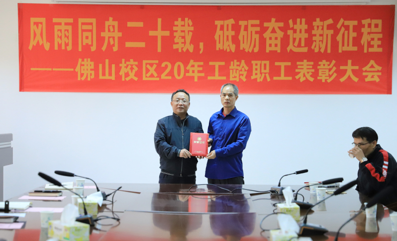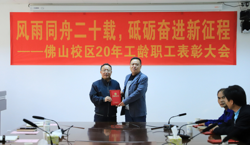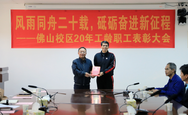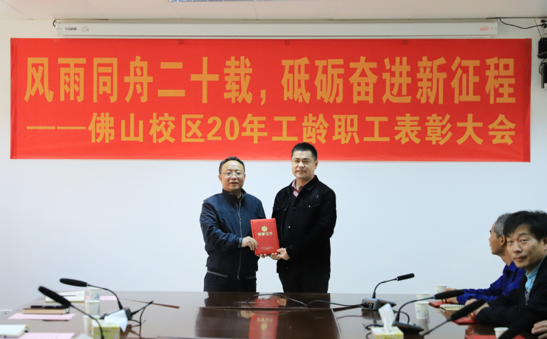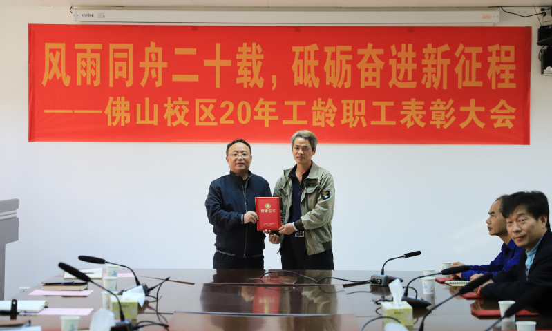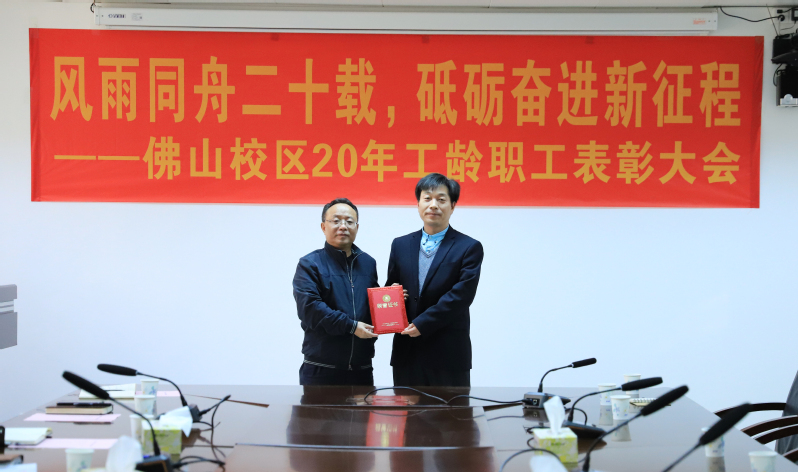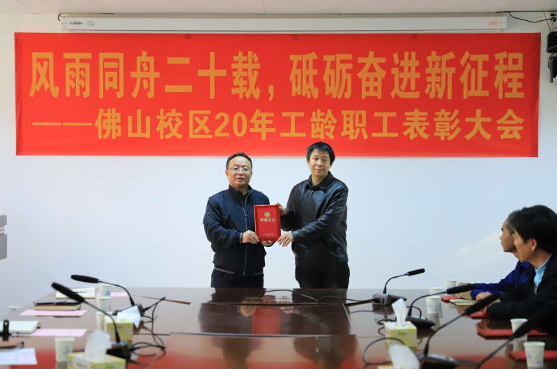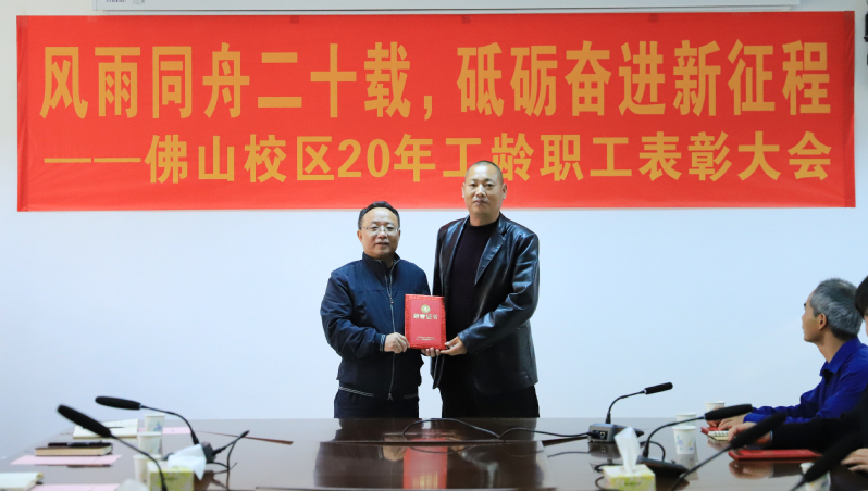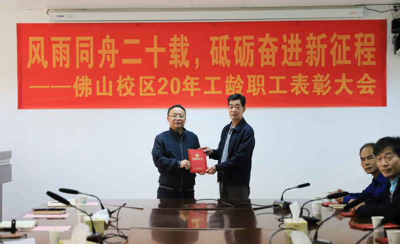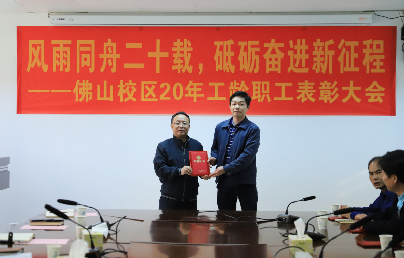 校区保卫办主任方彤彤宣读表彰决定,校区工龄二十年人员分别是吉家福、陈运保、王迎杰、陈顺中、王先纪、邓和平、苏国华、赵保国、利剑君、梁锦洪、李青、何易仲、王连成等13位职工,校长于海峰为以上职工颁发了荣誉证书。