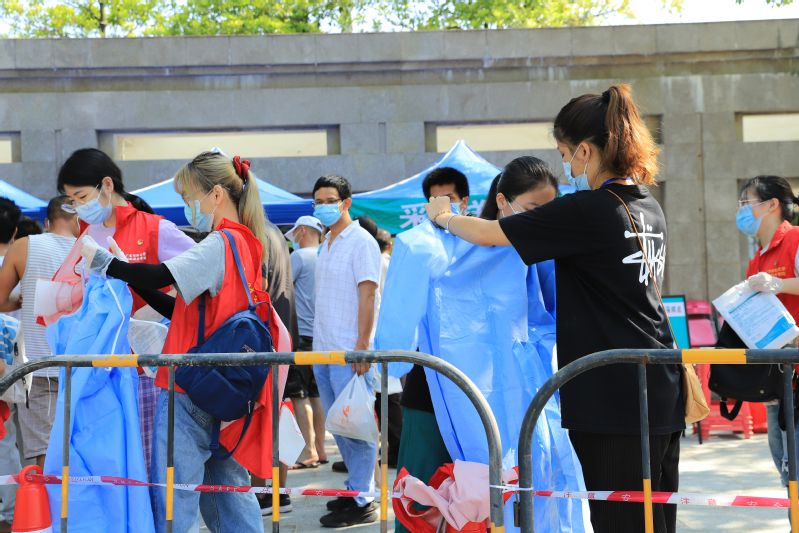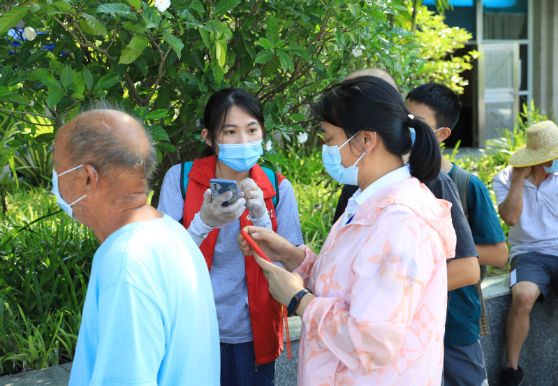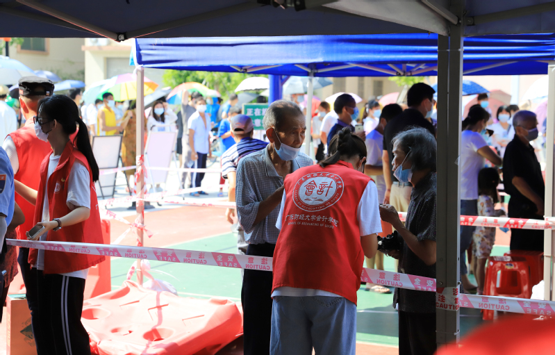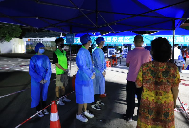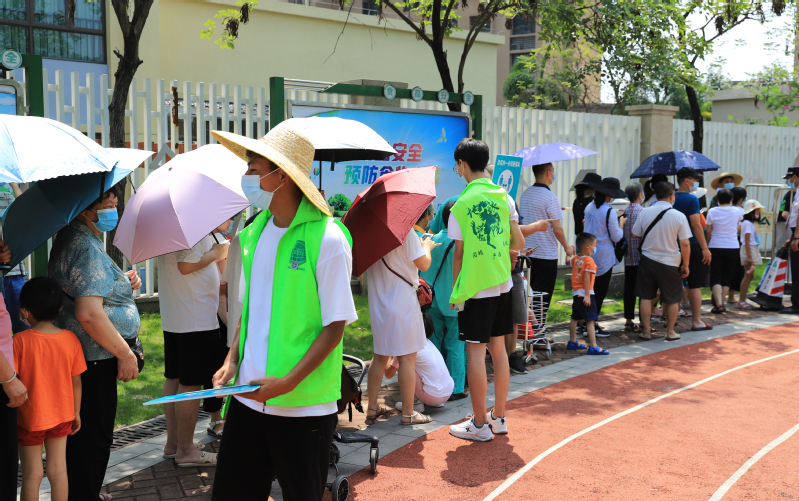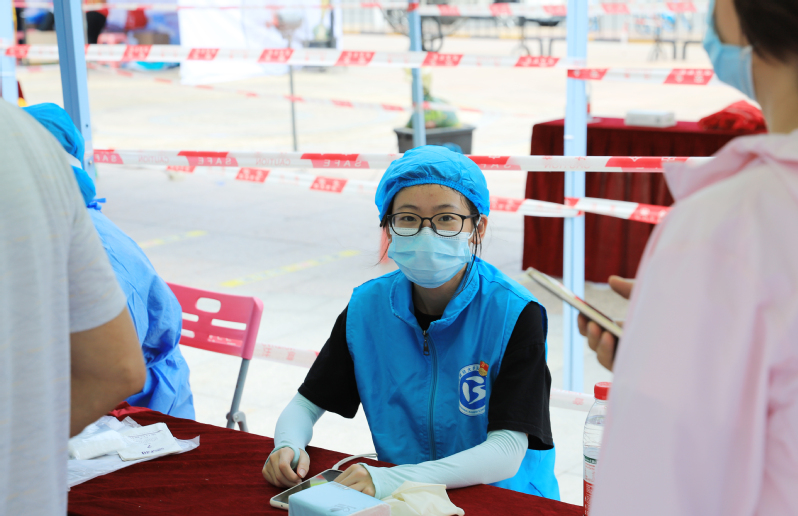 在各个检测点参与培训、熟悉工作流程后,我校志愿者快速进入工作状态。他们顶着炎炎烈日,冒着高温酷暑,忙碌的身影遍布入口引导、身份核对、秩序维持、等候引导、信息登记等环节。很多人由于需要不断的大声讲话,嗓子很快变得沙哑。他们顾不上喝水,仍然耐心为群众答疑解惑,引导居民有序排队。傍晚时分,第二班次的志愿者同学到位后,为了保证工作高效开展,仍有许多第一班次的志愿者主动要求留下来继续工作,希望能多出一份力,为居民提供更多的帮助。据统计,当天,我校半数以上的志愿者在岗位上累计工作近10小时。主动认真、热情有礼的工作状态得到政府工作人员及居民的认可与称赞。