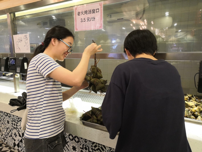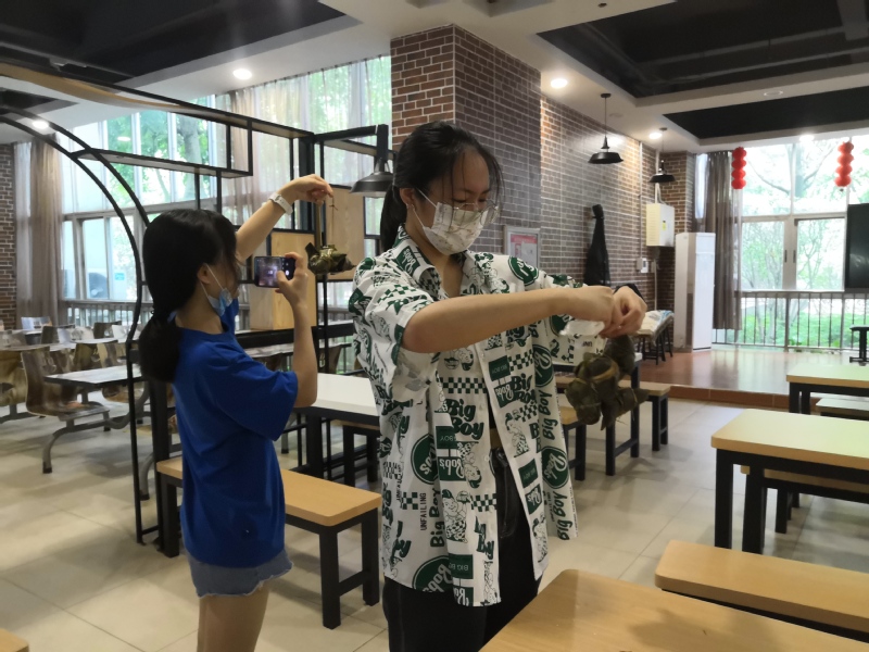 上午九点,饭堂阿姨已经备好食材,并耐心向同学们讲解示范包粽子的步骤。同学们跃跃欲试,纷纷动手包起粽子来。大家相互讨教不同的包法,粽叶一卷一盖,用草绳扎紧,不少第一次包粽子的同学们都包得有模有样。同学们还把自己亲手包的粽子串起来,和粽子合影发朋友圈。