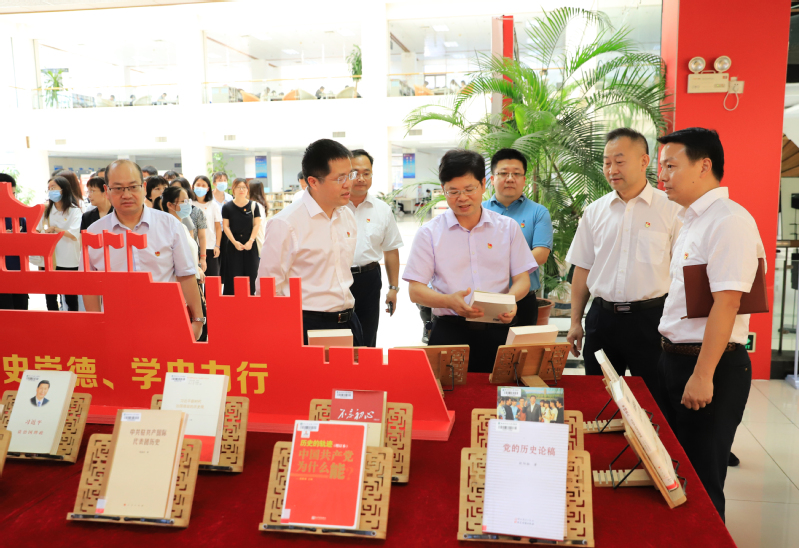 嘉宾与师生共同参观了本次主题展,并对主题书展和数字党史馆展览两部分内容表示了充分的肯定。罗贤甲表示,学校党史学习教育的推进应当突出铸魂育人,本次主题展丰富学生线上阅读与线下体验的红色资源,方便学生、服务学生,很有意义。