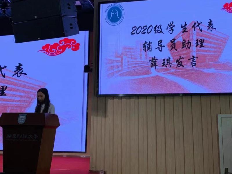 辅导员助理、2020级学生薛琪代表老生发言。薛琪分享了自己大学以来的经验和个人感悟,并建议新生们要尽早熟悉学校和学院的基本规则。薛琪向新生介绍到,只有在学习和工作中增强本领、养成好习惯,才能真正体会到大学的魅力、体验丰富多彩的大学生活。
