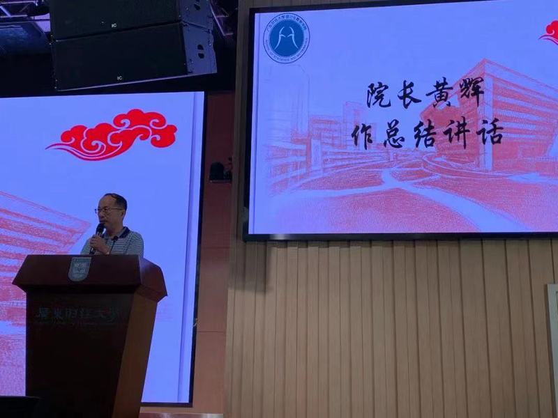 黄辉院长作总结讲话。黄辉带领大家回顾了每人的发言,并提醒新生们,是强大的祖国让学生能够放心地在美丽的校园中学习,大家应当心怀感恩、为早日实现中国梦而努力奋斗。黄辉以古今人物奋斗史为借鉴,勉励新生们要学会坚持目标不放弃,真正成为祖国的栋梁之才。