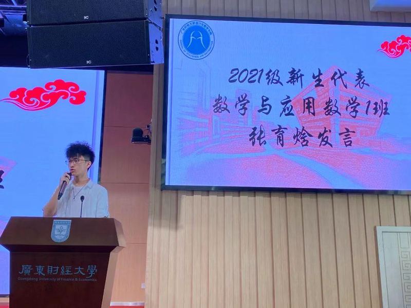 2021级新生代表、数学与应用数学1班张育焓代表新生发言。张育焓从高中生活的角度出发,展望了对大学生活的期待。张育焓表示希望能与同学们共勉,充分自我探索、找到热爱的事物,一起踏上新征程。