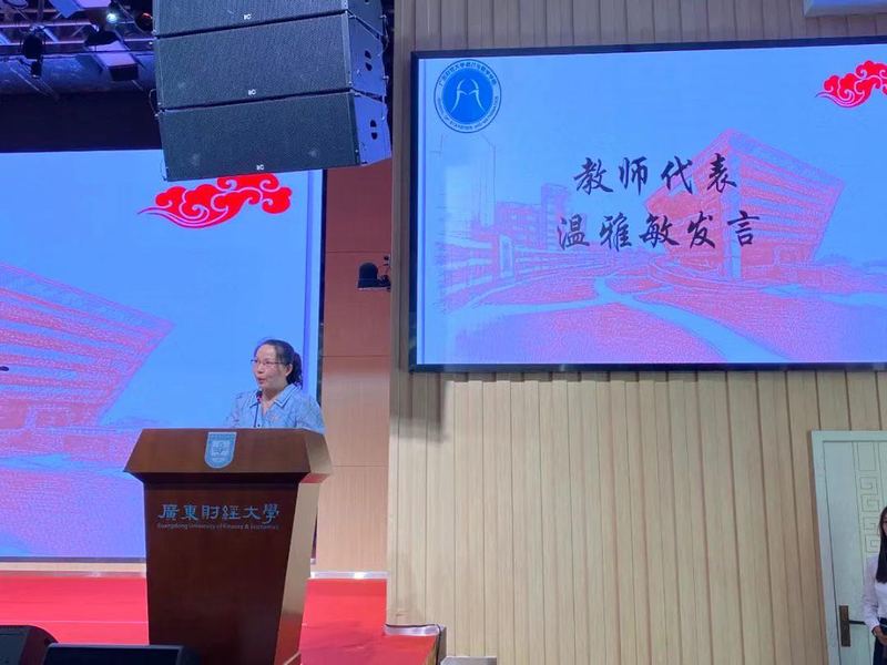 温雅敏作为学院教师代表发言。温雅敏向新生提出两个问题:为什么读大学?怎么规划自己的大学生活?温雅敏以自身体会叮嘱新生们要在学习和付出的过程中找到自己,养成终身学习的好习惯,尽早明确目标、少走弯路并持之以恒。