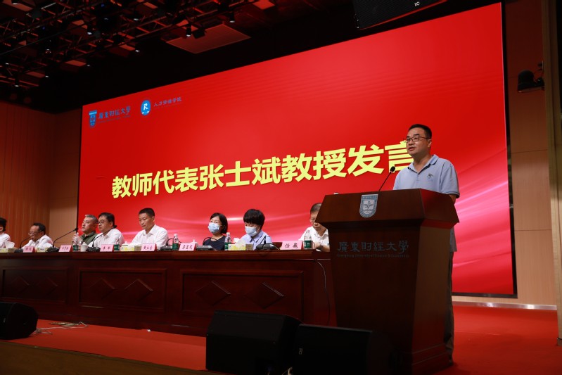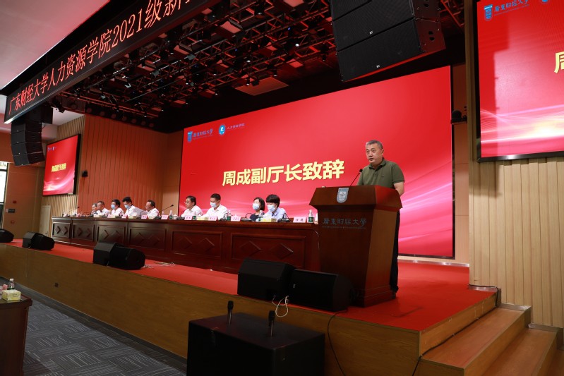 周成致辞,他代表广东省人力资源社会保障厅对我校人力资源学院成立表示热烈祝贺,并对我校成立人力资源学院这一战略举措充分肯定。周成指出,人力资源学院的成立必将有助于推动广东省人力资源和社会保障事业和人才事业的发展。他对人力资源学院的发展提出几点希望:第一,要强化特色办学,创新人才培养,坚持人才服务区域发展,努力打造一流的人才培养体系和社会服务平台。第二,全体教师要肩负起立德树人的使命,以赤诚之心、奉献之心、仁爱之心投身教育事业。第三,希望同学们能够珍惜时光,好好学习,掌握知识 本领,成为人力资源领域的佼佼者。