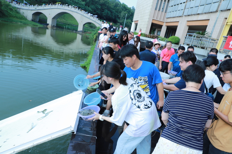 随后,放鱼活动正式开始。在场师生逐一有序参与放鱼。鱼儿争先恐后顺着滑道滑向湖里,湖面泛起圈圈金色的涟漪。本次共计向湖区投放6400尾鱼苗,含草鱼、鲫鱼、鳙鱼、鲢鱼等四个品种。部分师生是第一次以这样的方式与鱼儿亲密接触,放鱼归水、养护生态,他们认为这样的活动既有趣,又有意义,切身感受到人与自然的联系。