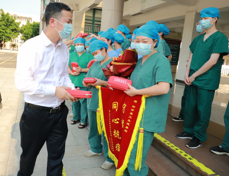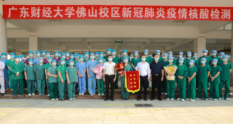 本次核酸检测从上午9点45分持续到中午2点15分,共计核酸13095人。核酸工作结束后,三水区区委常委吴可望、云东海街道书记刘勇海和学校党委常委、管委会主任王伟一起为驰援此次核酸检测的肇庆市封开县医疗队伍赠送“守望相助、同心抗疫”锦旗,表示诚挚谢意。