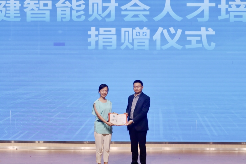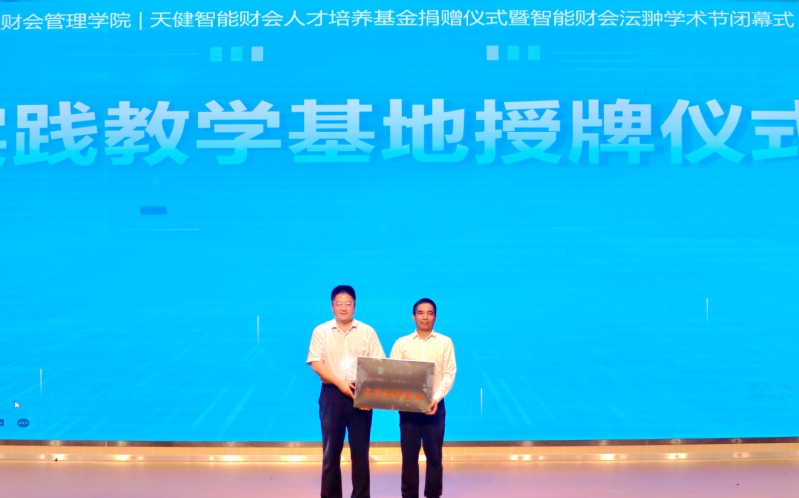 在活动中,与会领导和嘉宾为第一届大数据可视化大赛和第一届“天健杯”智能财会案例分析大赛获奖选手颁奖,段丹向天健会计师事务所(特殊普通合伙)广东分所代表梁明伟赠送捐赠证书,丁友刚和杨克晶共同为实践教学基地授牌。