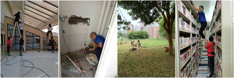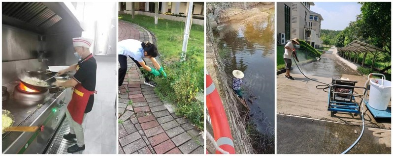 多措并举,积极推进校园环境美化优化工作。校园绿化养护紧锣密鼓,除草、修剪、打药,绿化人员经受住了烈日“烤”验,完成校园植物抗旱、日常绿化养护、修整校园行道树等养护工作,特别是校区那些自由生长的花草,被一双双巧手打造得更为美丽,营造出靓丽、整洁的校园环境。保洁员及时清理下水管道堵塞的树叶,减少积水等问题,扎实做好各个教学楼日常保洁工作,清理校园内各个区域卫生死角,确保校园卫生整洁。同时做好全校区化粪池、水池的清理清洗及校园内死角垃圾及垃圾桶的清理冲洗工作,保证校区干净卫生,为全校师生营造良好的校园环境。