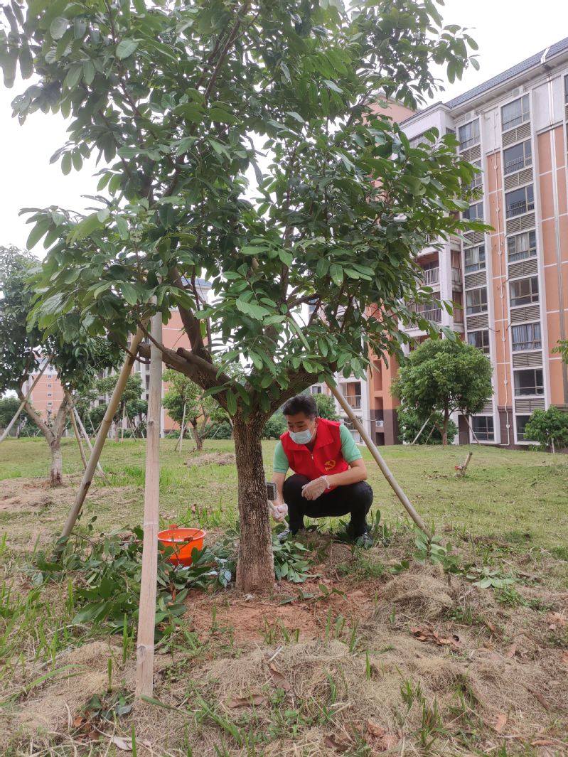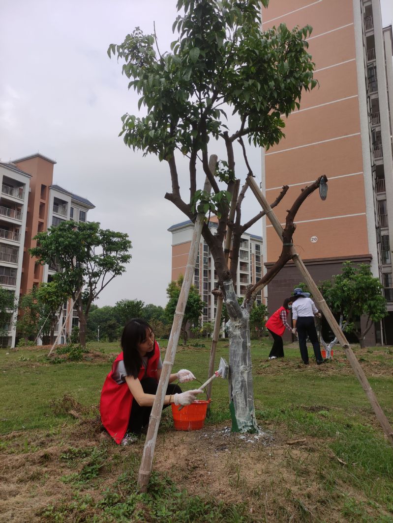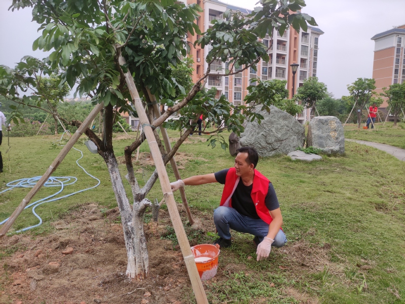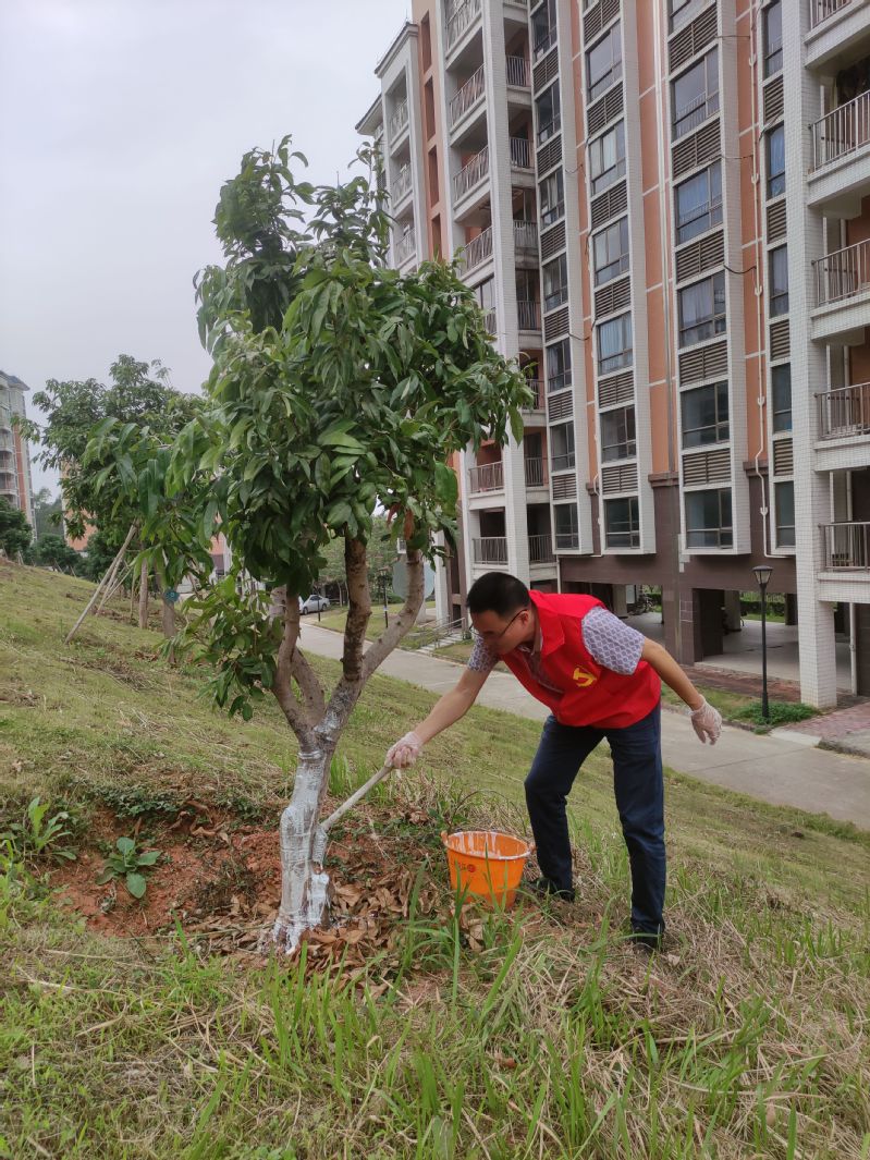 活动中,党员群众按照比例调配好新型树木防护涂料,在管护人员现场专业指导下均匀地涂到树干、树枝上。整个活动现场大家热火朝天,全体人员配合默契,干劲十足,充分发扬爱绿护绿、不怕苦、不怕累的劳动精神。众人拾柴火焰高,在大家的齐心协力下,果树林的龙眼树、荔枝树、柚子树等128余棵水果树木都穿上了白色新衣。