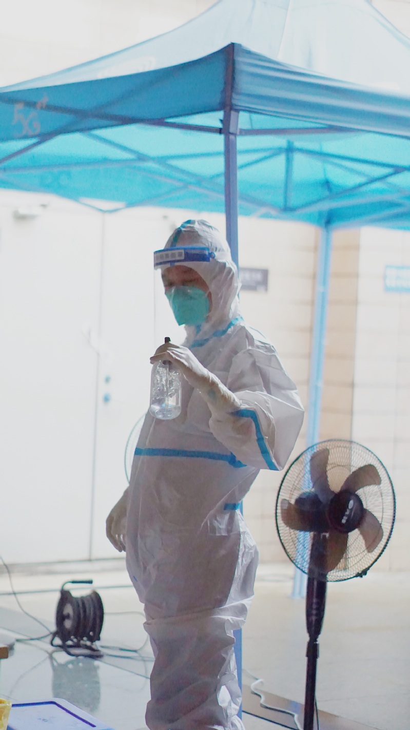 现场教职工志愿者表示,第一次“上战场”给学生采样,感觉“责任重大,使命光荣”,略显紧张,但“战斗”了半天后,操作更娴熟了,有信心会越采越专业!现场教职工因穿着全套防护服,采样结束后脱下防护手套后手掌不仅发白,还被勒出了很深的引子。
