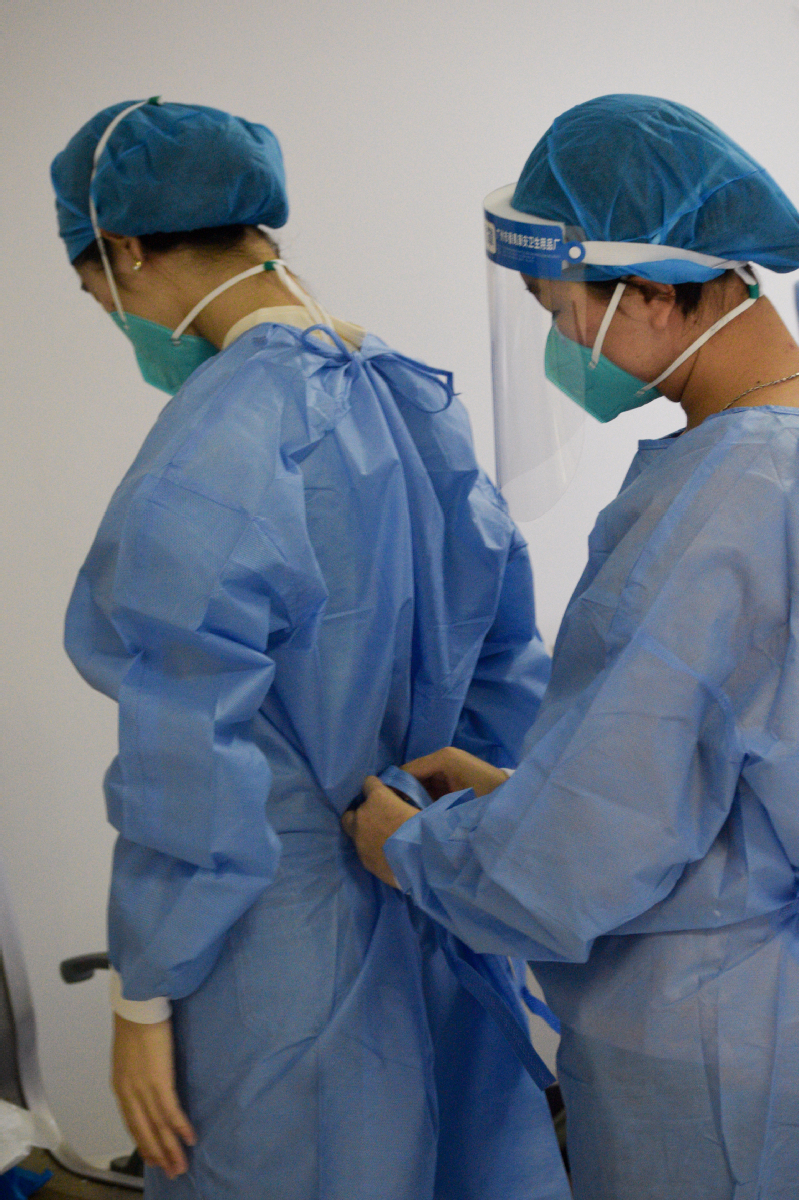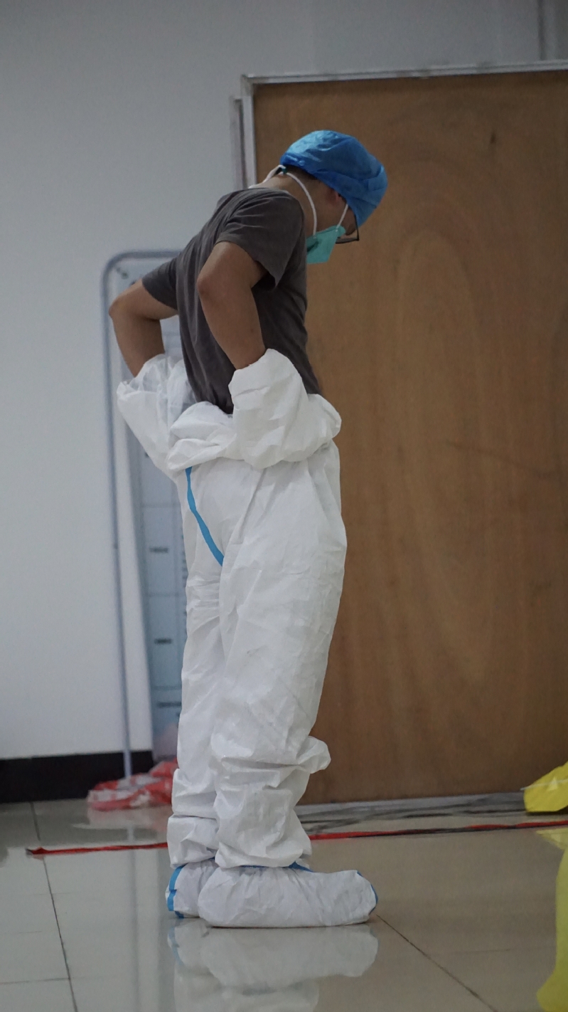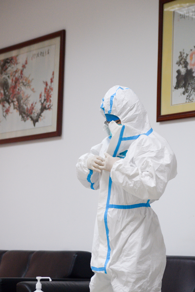 这是教职工志愿者们第一次作为采样人员增援m88核酸检测工作。在核酸开始前半个小时,志愿者均已到场集合。在这半个小时里,学校医护人员带领教工志愿者们领取防护服,并指导他们准确穿戴。核酸检测分上、下午两场,每一场核酸检测都由3名教职工和1位校医组成。全副武装后,大家便开展了长达3个小时不停歇的核酸采样工作。