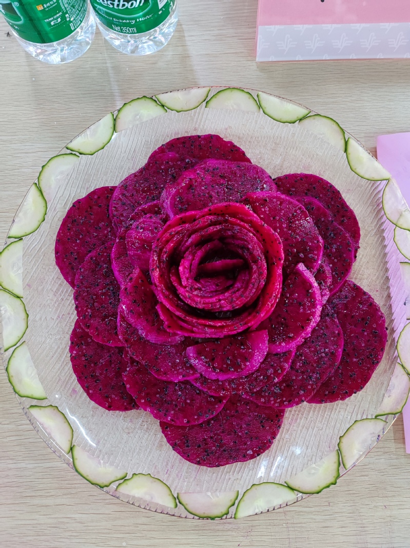 苹果、香蕉、火龙果、红提、葡萄、猕猴桃、橙子、圣女果、青枣、芒果……这些新鲜诱人的水果,经过大家的巧手,被改造成片、条、块、方、圆等等各种形状,拼出各种精巧的图案。