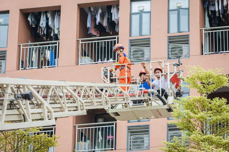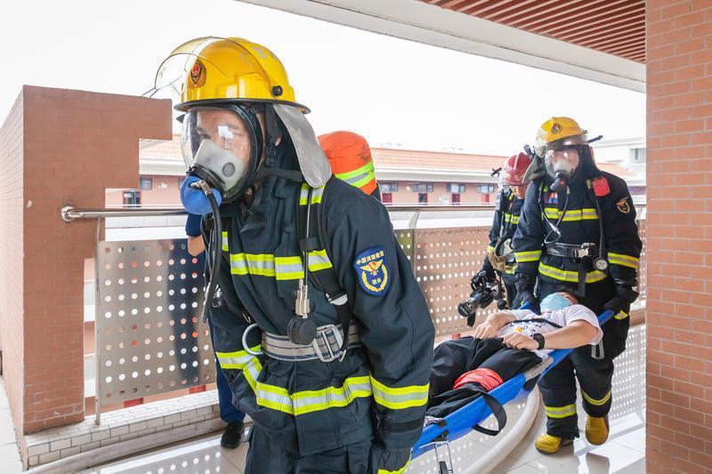 消防员使用担架转移被困在宿舍的“受伤学生”。