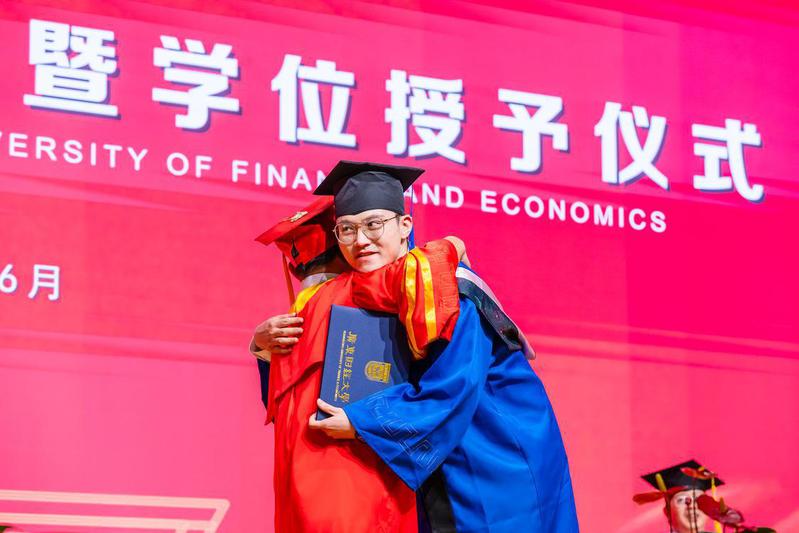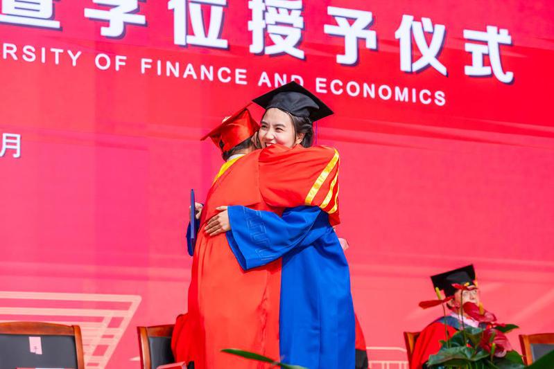 研究生毕业典礼专场上,m88校长于海峰与毕业生拥抱。/佛山市新闻传媒中心记者王澍摄